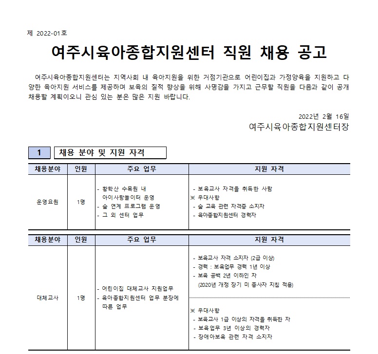 ¿©ÁÖ½ÃÀ°¾ÆÁ¾ÇÕÁö¿ø¼¾ÅÍ Á÷¿ø ä¿ë °ø°í (¿î¿µ¿ä¿ø, ´ëü±³»ç)