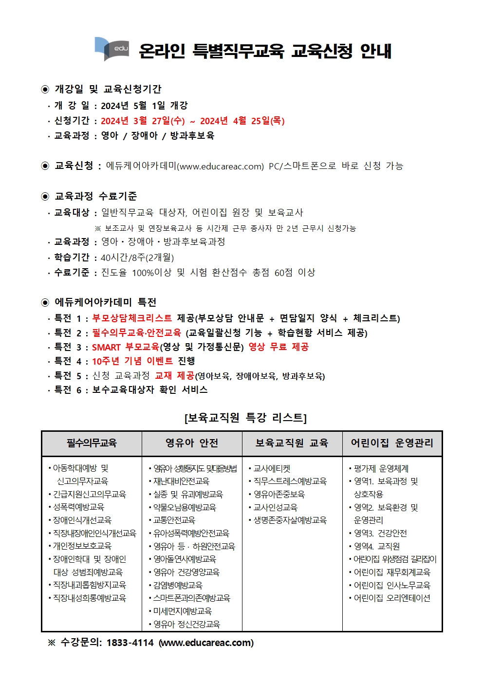 [¿¡µàÄÉ¾î¾ÆÄ«µ¥¹Ì] º¸À°±³Á÷¿ø ¿Â¶óÀΠƯº°Á÷¹«±³À° 2024³â 5¿ù °³° ±³À°½Åû ¾È³»