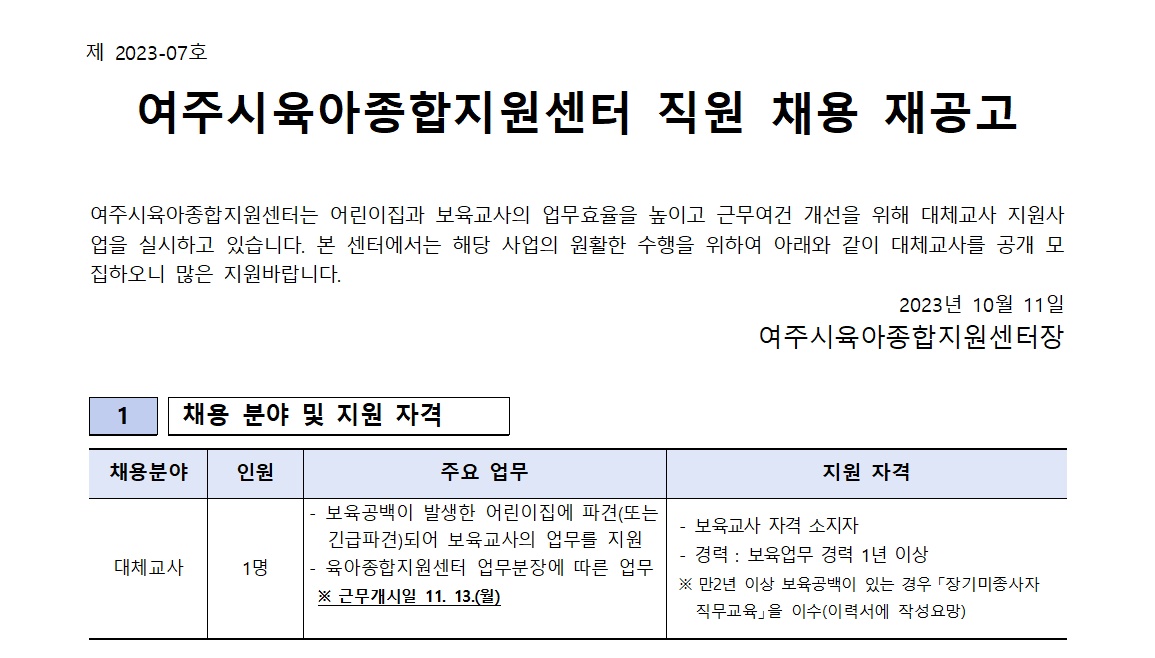 Á¦2023-07È£ ¿©ÁÖ½ÃÀ°¾ÆÁ¾ÇÕÁö¿ø¼¾ÅÍ ´ëü±³»ç ä¿ë Àç°ø°í