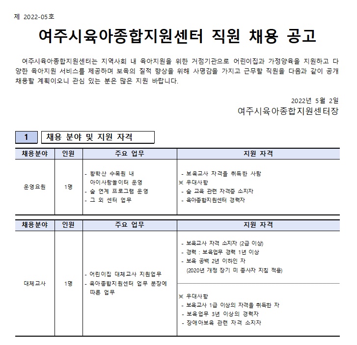 Á¦2022-05È£ ¿©ÁÖ½ÃÀ°¾ÆÁ¾ÇÕÁö¿ø¼¾ÅÍ Á÷¿ø ä¿ë °ø°í (¿î¿µ¿ä¿ø, ´ëü±³»ç)