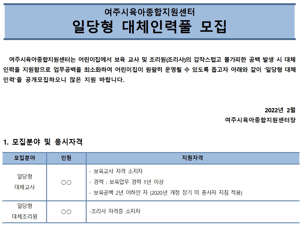 ¿©ÁÖ½ÃÀ°¾ÆÁ¾ÇÕÁö¿ø¼¾ÅÍ ÀϱÞÇü ´ëü±³»ç ¸ðÁý