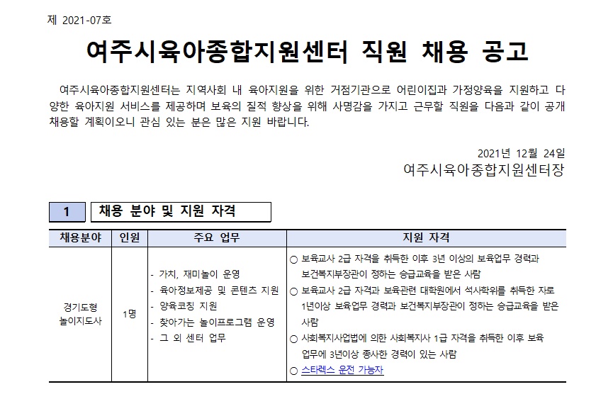 [Á¦2021-07È£] ¿©ÁÖ½ÃÀ°¾ÆÁ¾ÇÕÁö¿ø¼¾ÅÍ Á÷¿ø ä¿ë °ø°í - ³îÀÌÁöµµ»ç