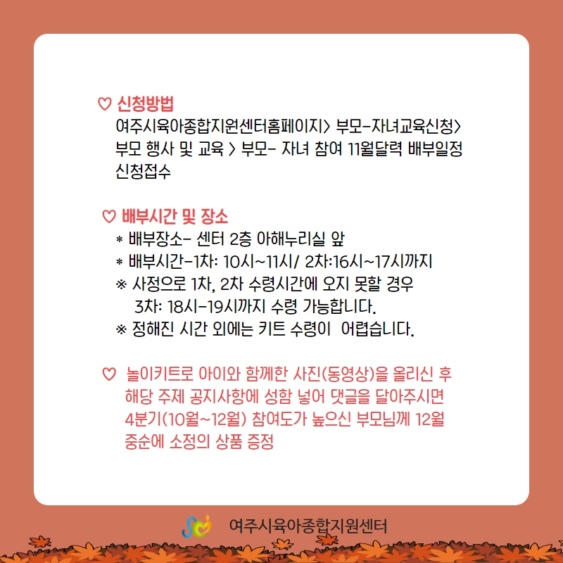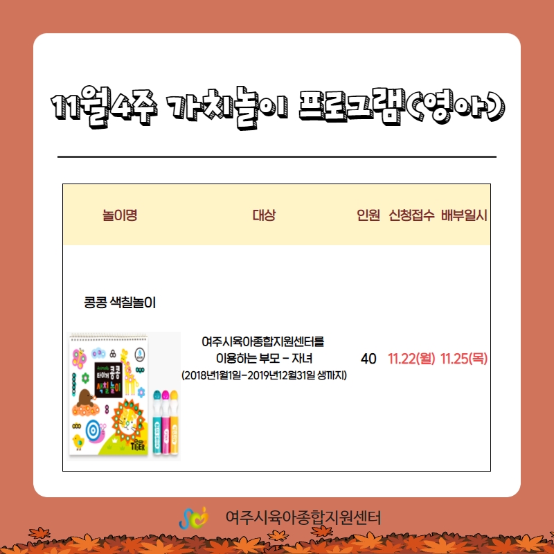 ½Åû±â°£ : 2021³â 11¿ù 22ÀÏ ¿ÀÀü 10:00 ~ ¼±Âø¼øÁ¢¼ö(20¸í) ´ë »ó : 2018³â 1¿ù1ÀÏ ~ 2019³â 12¿ù 31ÀÏ»ý±îÁö ½ÅûÁ¢¼ö °¡´ÉÇÕ´Ï´Ù.º» °¡Ä¡³îÀÌ ¹èºÎ´Â 11¿ù 25ÀÏ¿¡ ¿©ÁÖ½ÃÀ°¾ÆÁ¾ÇÕÁö¿ø¼¾ÅÍ 2Ãþ ¾ÆÇØ´©¸®½Ç ¾Õ¿¡¼ ¹èºÎÇØ µå¸³´Ï´Ù.