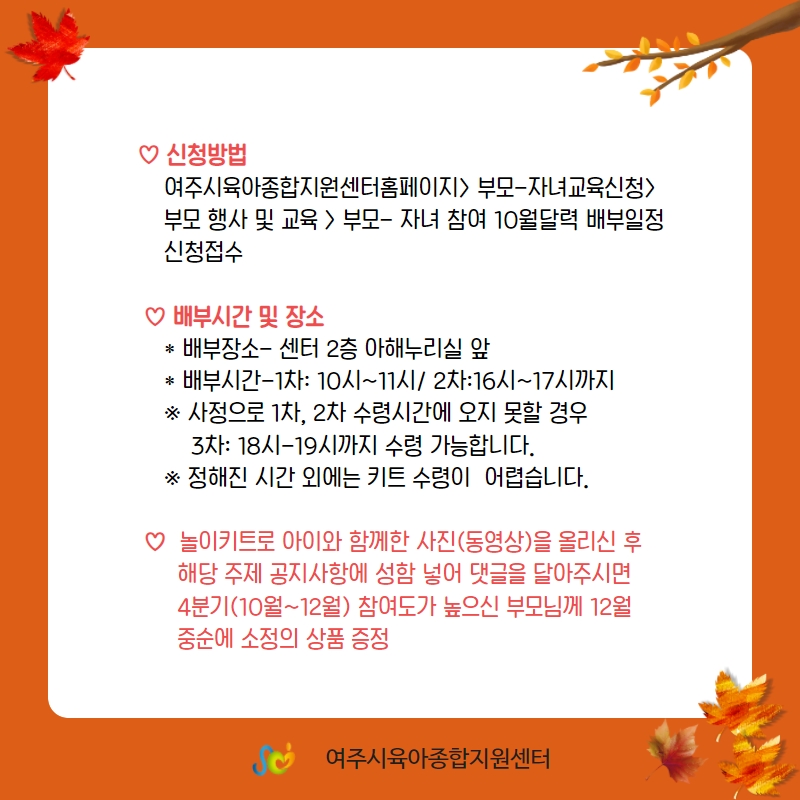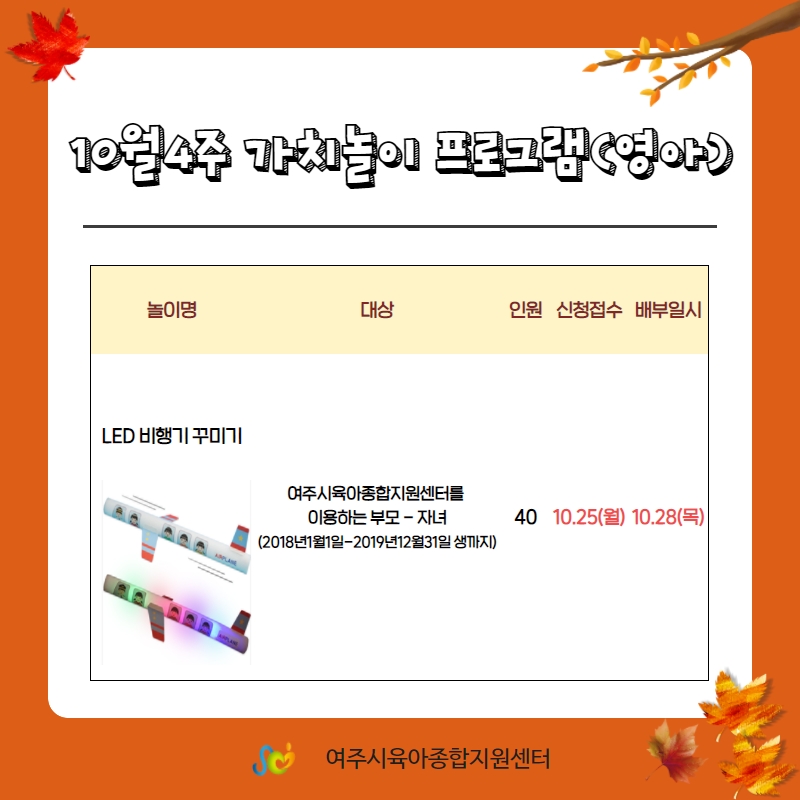 ½Åû±â°£ : 2021³â 10¿ù 25ÀÏ ¿ÀÀü 10:00 ~ ¼±Âø¼øÁ¢¼ö(20¸í) ´ë »ó : 2018³â 1¿ù1ÀÏ ~ 2019³â 12¿ù 31ÀÏ»ý±îÁö ½ÅûÁ¢¼ö °¡´ÉÇÕ´Ï´Ù.º» °¡Ä¡³îÀÌ ¹èºÎ´Â 10¿ù 28ÀÏ¿¡ ¿©ÁÖ½ÃÀ°¾ÆÁ¾ÇÕÁö¿ø¼¾ÅÍ 2Ãþ ¾ÆÇØ´©¸®½Ç ¾Õ¿¡¼ ¹èºÎÇØ µå¸³´Ï´Ù.