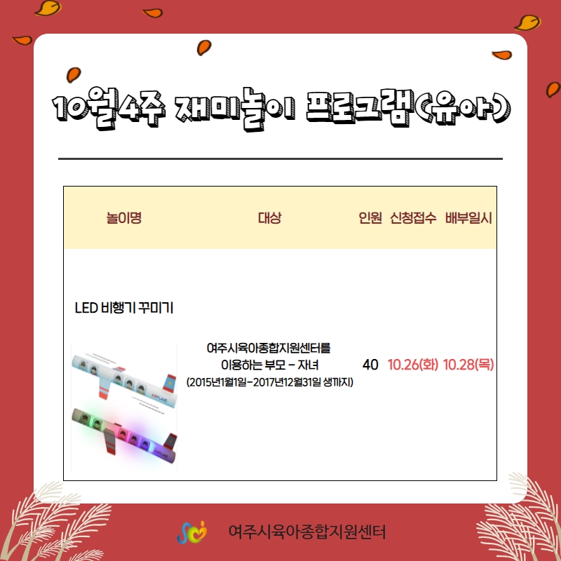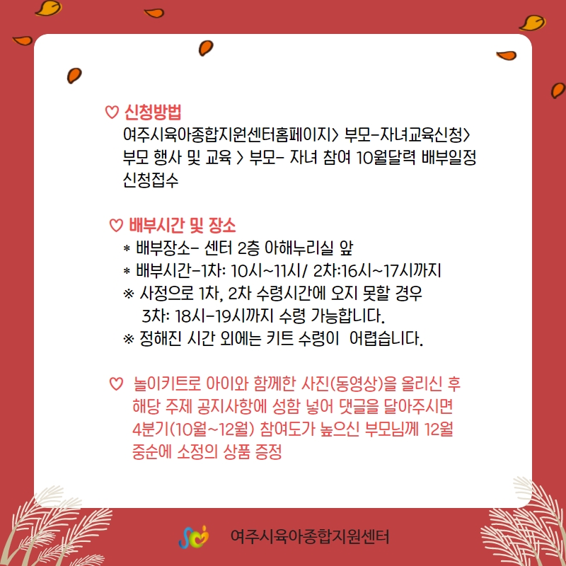½Åû±â°£ : 2021³â 10¿ù 26ÀÏ ¿ÀÀü 10:00 ~ ¼±Âø¼øÁ¢¼ö(20¸í) ´ë »ó : 2015³â 1¿ù1ÀÏ ~ 2017³â 12¿ù 31ÀÏ»ý±îÁö ½ÅûÁ¢¼ö °¡´ÉÇÕ´Ï´Ù.º» Àç¹Ì³îÀÌ ¹èºÎ´Â 10¿ù 28ÀÏ¿¡ ¿©ÁÖ½ÃÀ°¾ÆÁ¾ÇÕÁö¿ø¼¾ÅÍ 2Ãþ ¾ÆÇØ´©¸®½Ç ¾Õ¿¡¼ ¹èºÎÇØ µå¸³´Ï´Ù.