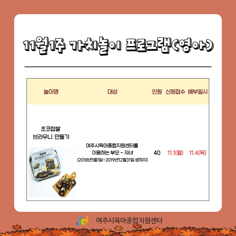 ½Åû±â°£ : 2021³â 11¿ù 1ÀÏ ¿ÀÀü 10:00 ~ ¼±Âø¼øÁ¢¼ö(20¸í) ´ë »ó : 2018³â 1¿ù1ÀÏ ~ 2019³â 12¿ù 31ÀÏ»ý±îÁö ½ÅûÁ¢¼ö °¡´ÉÇÕ´Ï´Ù.º» °¡Ä¡³îÀÌ ¹èºÎ´Â 11¿ù 4ÀÏ¿¡ ¿©ÁÖ½ÃÀ°¾ÆÁ¾ÇÕÁö¿ø¼¾ÅÍ 2Ãþ ¾ÆÇØ´©¸®½Ç ¾Õ¿¡¼ ¹èºÎÇØ µå¸³´Ï´Ù.