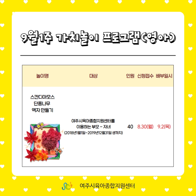 ½Åû±â°£ : 2021³â 8¿ù 30ÀÏ ¿ÀÀü 10:00 ~ ¼±Âø¼øÁ¢¼ö(20¸í) ´ë »ó : 2018³â 1¿ù1ÀÏ ~ 2019³â 12¿ù 31ÀÏ»ý±îÁö ½ÅûÁ¢¼ö °¡´ÉÇÕ´Ï´Ù.º» °¡Ä¡³îÀÌ ¹èºÎ´Â 9¿ù 2ÀÏ¿¡ ¿©ÁÖ½ÃÀ°¾ÆÁ¾ÇÕÁö¿ø¼¾ÅÍ 2Ãþ ¾ÆÇØ´©¸®½Ç ¾Õ¿¡¼ ¹èºÎÇØ µå¸³´Ï´Ù.