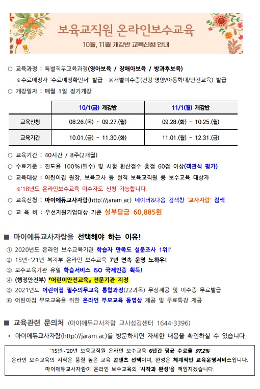 [¸¶ÀÌ¿¡µà±³»çÀÚ¶÷] º¸À°±³Á÷¿ø ¿Â¶óÀκ¸¼ö±³À° 10¿ù °³°¹Ý ±³À°½Åû ¾È³»