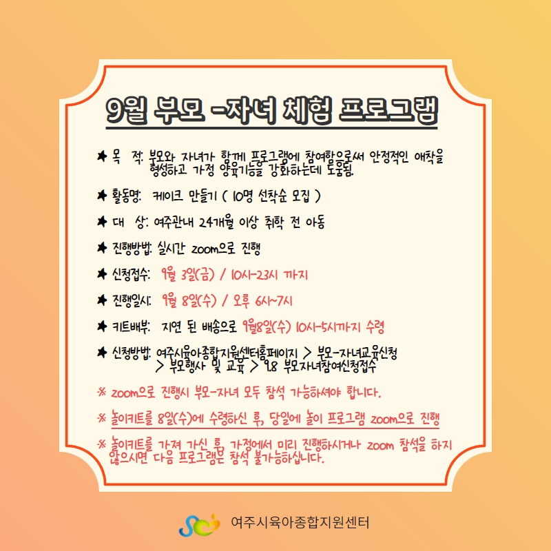 ½Åû±â°£ : 2021³â 9¿ù 3ÀÏ(±Ý) /¿ÀÀü 10:00 ~ ¼±Âø¼øÁ¢¼ö(20¸í) ŰƮ¹èºÎ : Åùè Áö¿¬À¸·Î 2021³â 9¿ù 8ÀÏ(¼ö) / 10½Ã~17½Ã(Á¦¿Ü12½Ã-13½Ã) ÁøÇà¹æ¹ý : 2021³â 9¿ù 8ÀÏ(¼ö) / 6½Ã-7½Ã±îÁö ½Ç½Ã°£ zoomÀ¸·Î ÁøÇà(ºÎ¸ð¿Í ÀÚ³à ¸ðµÎ Âü¿©) ŰƮ¸¦ ¼ö·ÉÇϽŠÈÄ, ´çÀÏ 9.8(¸ñ)¿¡ zoomÀ» ÀÌ¿ëÇÏ¿© ´ã´çÀÚ¿Í ³îÀ̸¦ °°ÀÌ ÁøÇà. ¼ö·ÉÇϽŠŰƮ´Â ¹Ì¸® ÁøÇà ¾ÈµË´Ï´Ù./ zoom Âü¿© °¡´ÉÇϽа¡Á¤¿¡¼¸¸ ½ÅûºÎʵ右´Ï´Ù.↑ À§ ±×¸²À» Ŭ¸¯ÇÏ½Ã¸é ½ÅûÁ¢¼ö ÆäÀÌÁö·Î À̵¿µË´Ï´Ù.
