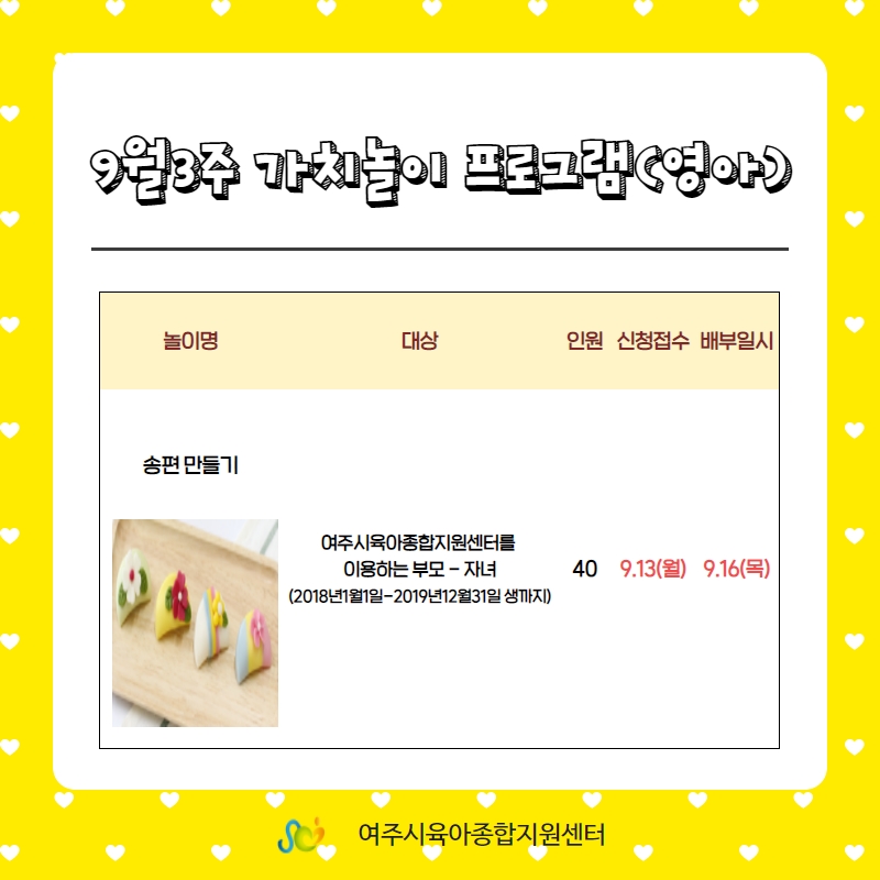 ½Åû±â°£ : 2021³â 9¿ù 13ÀÏ ¿ÀÀü 10:00 ~ ¼±Âø¼øÁ¢¼ö(20¸í) ´ë »ó : 2018³â 1¿ù1ÀÏ ~ 2019³â 12¿ù 31ÀÏ»ý±îÁö ½ÅûÁ¢¼ö °¡´ÉÇÕ´Ï´Ù.º» °¡Ä¡³îÀÌ ¹èºÎ´Â 9¿ù 16ÀÏ¿¡ ¿©ÁÖ½ÃÀ°¾ÆÁ¾ÇÕÁö¿ø¼¾ÅÍ 2Ãþ ¾ÆÇØ´©¸®½Ç ¾Õ¿¡¼ ¹èºÎÇØ µå¸³´Ï´Ù.