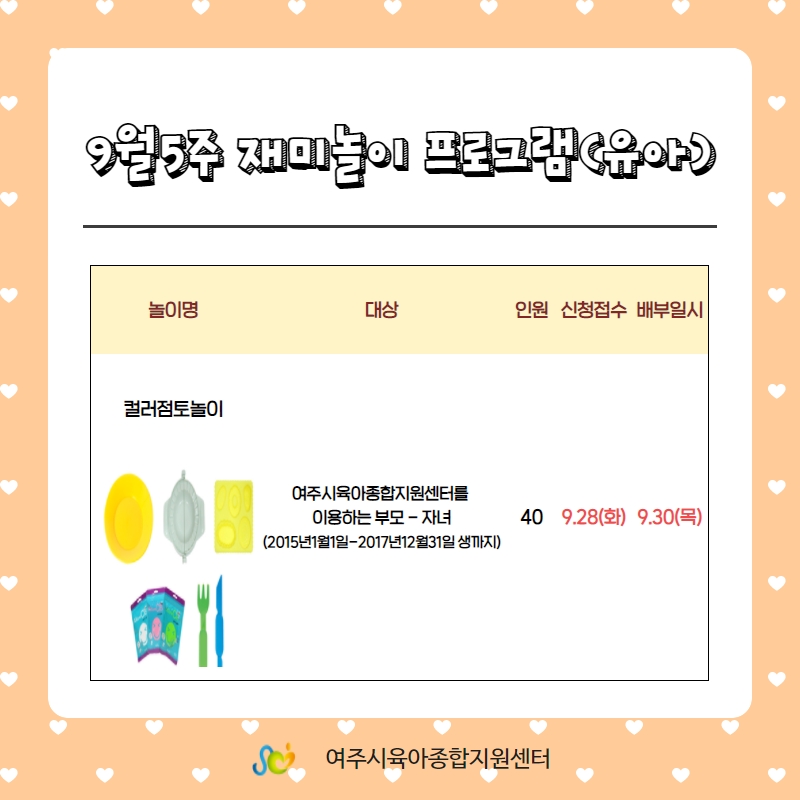 ½Åû±â°£ : 2021³â 9¿ù 28ÀÏ ¿ÀÀü 10:00 ~ ¼±Âø¼øÁ¢¼ö(20¸í) ´ë »ó : 2015³â 1¿ù1ÀÏ ~ 2017³â 12¿ù 31ÀÏ»ý±îÁö ½ÅûÁ¢¼ö °¡´ÉÇÕ´Ï´Ù.º» Àç¹Ì³îÀÌ ¹èºÎ´Â 9¿ù 30ÀÏ¿¡ ¿©ÁÖ½ÃÀ°¾ÆÁ¾ÇÕÁö¿ø¼¾ÅÍ 2Ãþ ¾ÆÇØ´©¸®½Ç ¾Õ¿¡¼ ¹èºÎÇØ µå¸³´Ï´Ù.