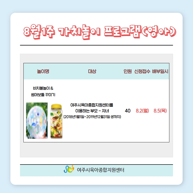 ½Å û : ¿©ÁÖ½ÃÀ°¾ÆÁ¾ÇÕÁö¿ø¼¾ÅÍ È¨ÆäÀÌÁö Á¢¼ö ½Åû±â°£ : 2020³â 8¿ù 2ÀÏ ¿ÀÀü 10:00 ~ ¼±Âø¼øÁ¢¼ö(20¸í) ´ë »ó : 2018³â 1¿ù1ÀÏ ~ 2019³â 12¿ù 31ÀÏ»ý±îÁö ½ÅûÁ¢¼ö °¡´ÉÇÕ´Ï´Ù.º» °¡Ä¡³îÀÌ ¹èºÎ´Â 8¿ù 5ÀÏ¿¡ ¿©ÁÖ½ÃÀ°¾ÆÁ¾ÇÕÁö¿ø¼¾ÅÍ 2Ãþ