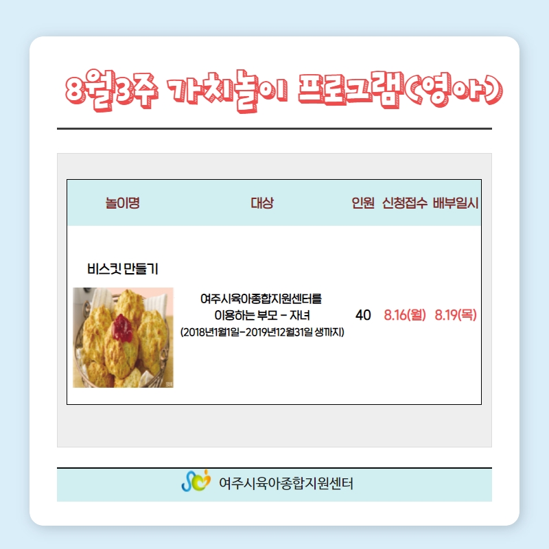 ½Å û : ¿©ÁÖ½ÃÀ°¾ÆÁ¾ÇÕÁö¿ø¼¾ÅÍ È¨ÆäÀÌÁö Á¢¼ö ½Åû±â°£ : 2020³â 8¿ù 16ÀÏ ¿ÀÀü 10:00 ~ ¼±Âø¼øÁ¢¼ö(20¸í) ´ë »ó : 2018³â 1¿ù1ÀÏ ~ 2019³â 12¿ù 31ÀÏ»ý±îÁö ½ÅûÁ¢¼ö °¡´ÉÇÕ´Ï´Ù.º» °¡Ä¡³îÀÌ ¹èºÎ´Â 8¿ù 19ÀÏ¿¡ ¿©ÁÖ½ÃÀ°¾ÆÁ¾ÇÕÁö¿ø¼¾ÅÍ 2Ãþ