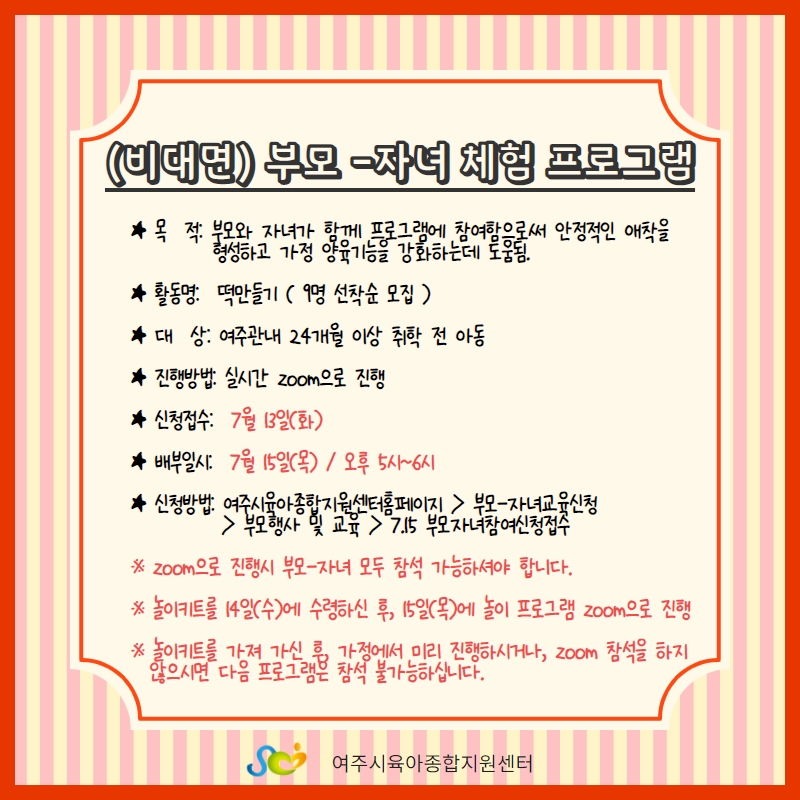 ½Å û : ¿©ÁÖ½ÃÀ°¾ÆÁ¾ÇÕÁö¿ø¼¾ÅÍ È¨ÆäÀÌÁö Á¢¼ö ½Åû±â°£ : 2021³â 7¿ù 13ÀÏ(È) ¿ÀÀü 10:00 ~ ¼±Âø¼øÁ¢¼ö(9¸í) ŰƮ¹èºÎ : 2021³â 7¿ù 14ÀÏ(¼ö) 10½Ã~18½Ã(Á¦¿Ü12½Ã-13½Ã) ÁøÇà¹æ¹ý : 2021³â 7¿ù 15ÀÏ(¸ñ) ½Ç½Ã°£ zoomÀ¸·Î ÁøÇà(ºÎ¸ð¿Í ÀÚ³à ¸ðµÎ Âü¿©) ŰƮ¸¦ ¼ö·ÉÇϽŠÈÄ, 7.15(¸ñ)¿¡ zoomÀ» ÀÌ¿ëÇÏ¿© ´ã´çÀÚ¿Í ³îÀ̸¦ °°ÀÌ ÁøÇà. ¼ö·ÉÇϽŠŰƮ´Â ¹Ì¸® ÁøÇà ¾ÈµË´Ï´Ù./ zoom Âü¿© °¡´ÉÇϽа¡Á¤¿¡¼¸¸ ½ÅûºÎʵ右´Ï´Ù.↑ À§ ±×¸²À» Ŭ¸¯ÇÏ½Ã¸é ½ÅûÁ¢¼ö ÆäÀÌÁö·Î À̵¿µË´Ï´Ù.