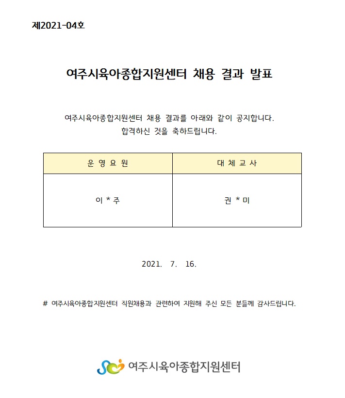 ¿©ÁÖ½ÃÀ°¾ÆÁ¾ÇÕÁö¿ø¼¾ÅÍ Á÷¿ø ä¿ë °á°ú ¹ßÇ¥