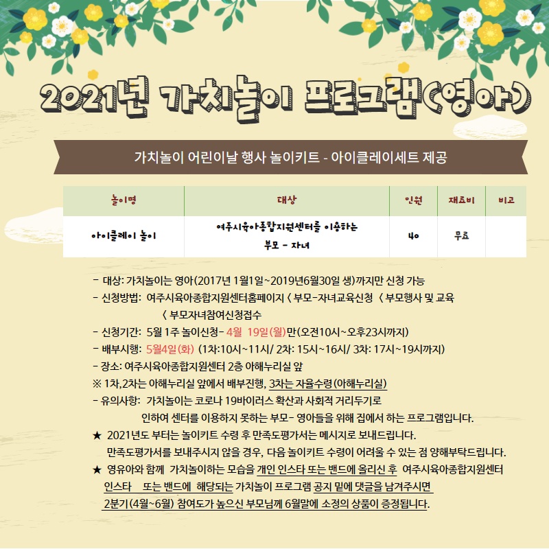 ½Å û : ¿©ÁÖ½ÃÀ°¾ÆÁ¾ÇÕÁö¿ø¼¾ÅÍ È¨ÆäÀÌÁö Á¢¼ö ½Åû±â°£ : 2020³â 4¿ù 19ÀÏ ¿ÀÀü 10:00 ~ ¼±Âø¼øÁ¢¼ö(20¸í)º» °¡Ä¡³îÀÌ ¹èºÎ´Â 5¿ù 4ÀÏ¿¡