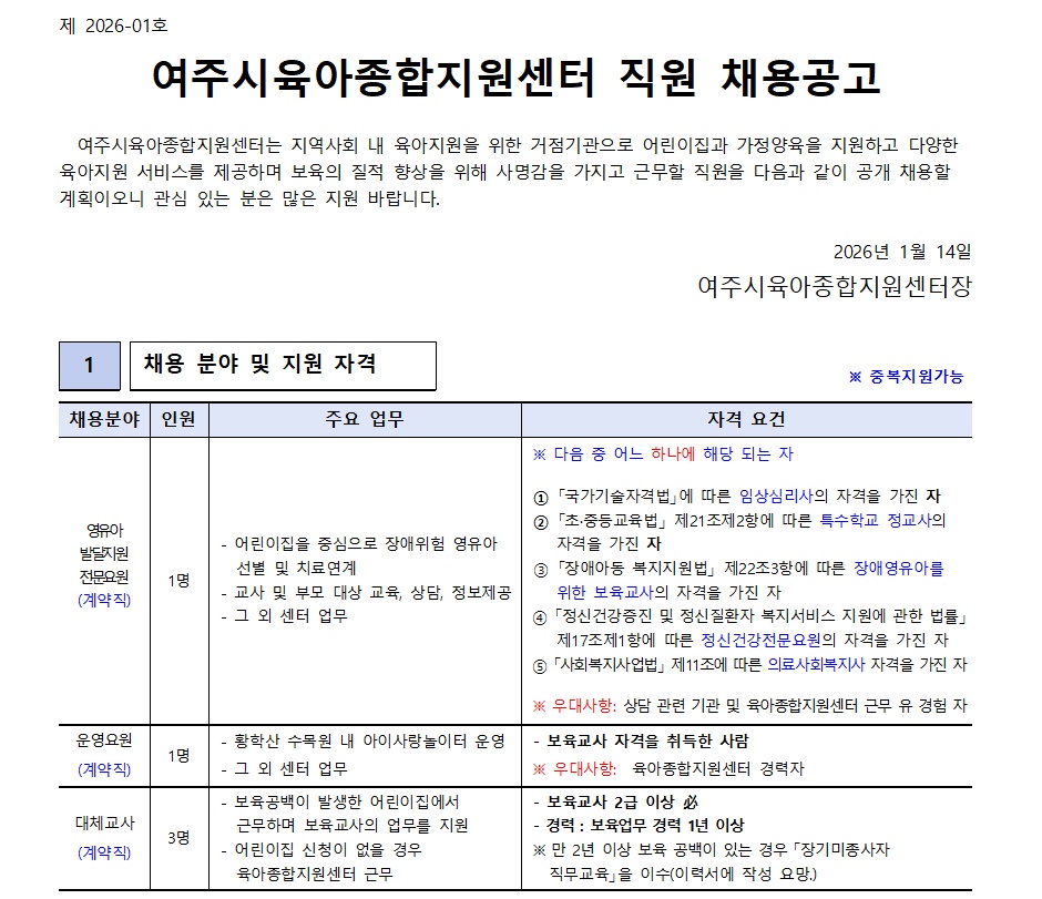 Á¦2026-01È£ ¿©ÁÖ½ÃÀ°¾ÆÁ¾ÇÕÁö¿ø¼¾ÅÍ Á÷¿ø[¿µÀ¯¾Æ¹ß´ÞÁö¿øÀü¹®¿ä¿ø, ¿î¿µ¿ä¿ø, ´ëü±³»ç] ä¿ë °ø°í