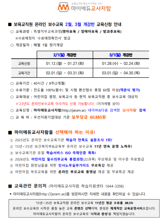 [¸¶ÀÌ¿¡µà±³»çÀÚ¶÷] º¸À°±³Á÷¿ø ¿Â¶óÀκ¸¼ö±³À° 2¿ù °³°¹Ý ±³À°½Åû ¾È³»