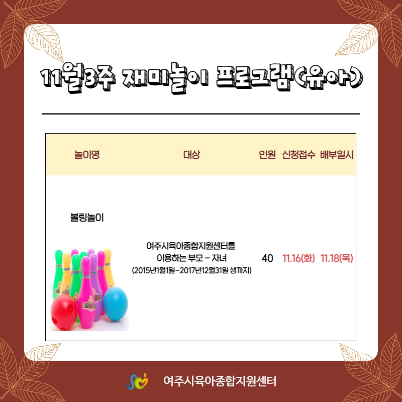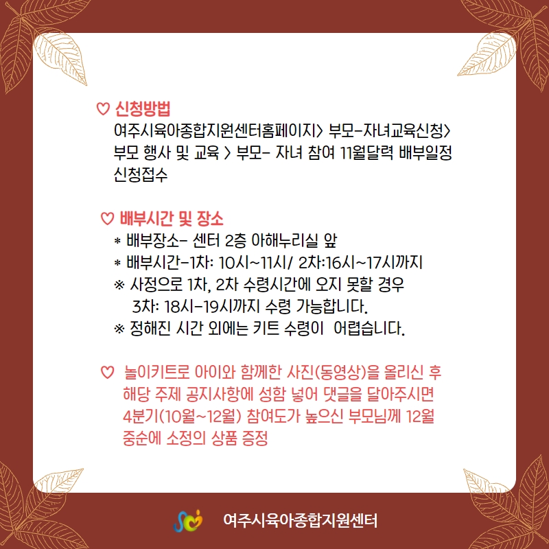 ½Åû±â°£ : 2021³â 11¿ù 16ÀÏ ¿ÀÀü 10:00 ~ ¼±Âø¼øÁ¢¼ö(20¸í) ´ë »ó : 2015³â 1¿ù1ÀÏ ~ 2017³â 12¿ù 31ÀÏ»ý±îÁö ½ÅûÁ¢¼ö °¡´ÉÇÕ´Ï´Ù.º» Àç¹Ì³îÀÌ ¹èºÎ´Â 11¿ù 18ÀÏ¿¡ ¿©ÁÖ½ÃÀ°¾ÆÁ¾ÇÕÁö¿ø¼¾ÅÍ 2Ãþ ¾ÆÇØ´©¸®½Ç ¾Õ¿¡¼ ¹èºÎÇØ µå¸³´Ï´Ù.