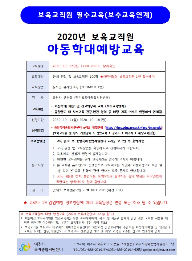 | ±âŸ»çÇ× | # ¾î¸°ÀÌÁý´ç º¸À°±³Á÷¿ø 1ÀÎ Çʼö Âü¿© # ½Åû¹æ¹ý - Áß¾ÓÀ°¾ÆÁ¾ÇÕÁö¿ø¼¾ÅÍ e·¯´× °³º°½Åû(http://lms.educare.or.kr/lms/intro.edu) (º¸À°±³Á÷¿ø ¹× ºÎ¸ð°³¼³°ÁÂ>ÁýÇÕ±³À°>°æ±âµµ>¿©ÁÖ½Ã>ÇØ´ç±³À°½Åû) |