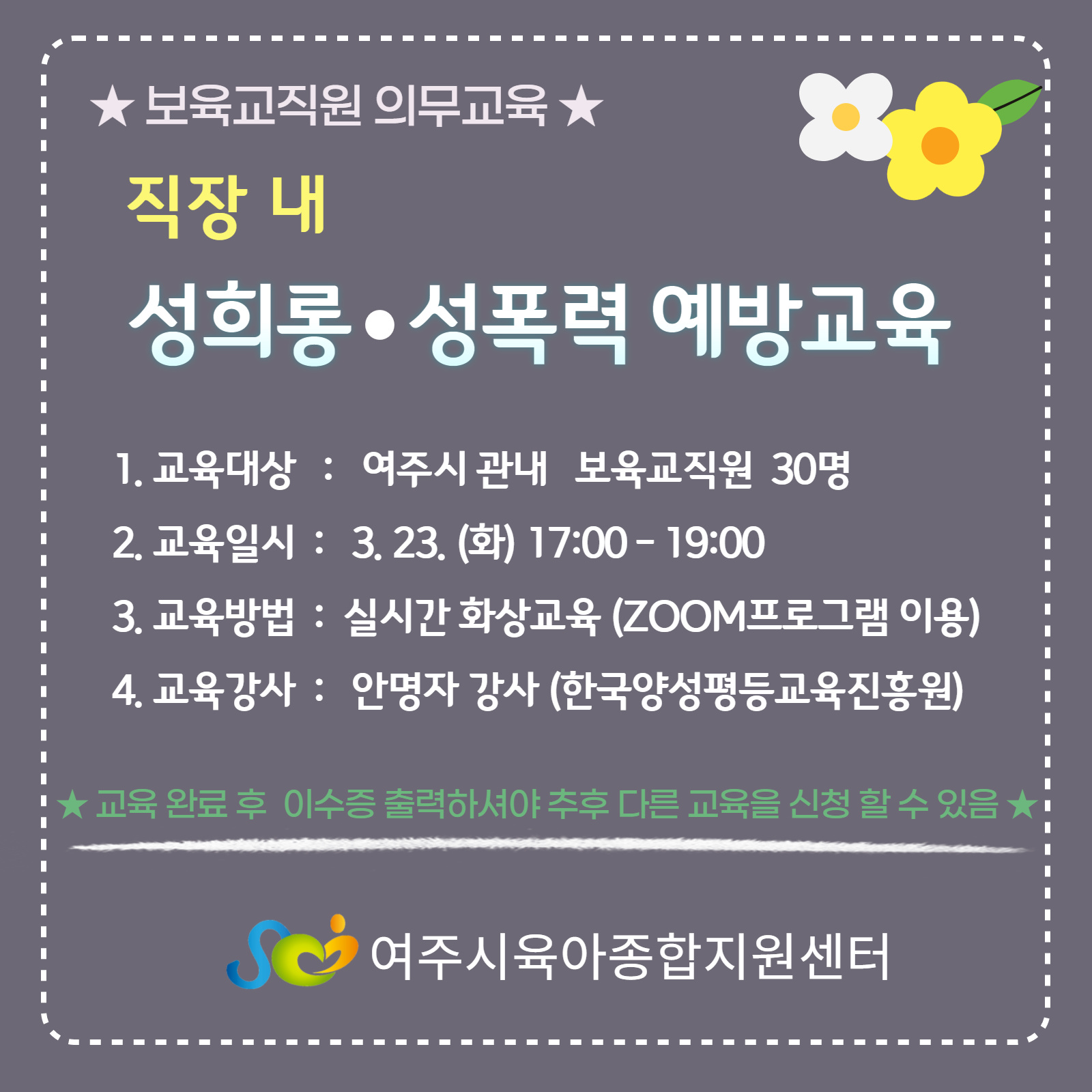 | °»ç | ¾È¸íÀÚ°»ç (Çѱ¹¾ç¼ºÆòµî±³À°ÁøÈï¿ø À§Ã˰»ç/°æ±âµµ°¡Á·¿©¼º¿¬±¸¿ø) | Àå¼Ò | zoomÀ» Ȱ¿ëÇÑ ½Ç½Ã°£ È»ó±³À° |