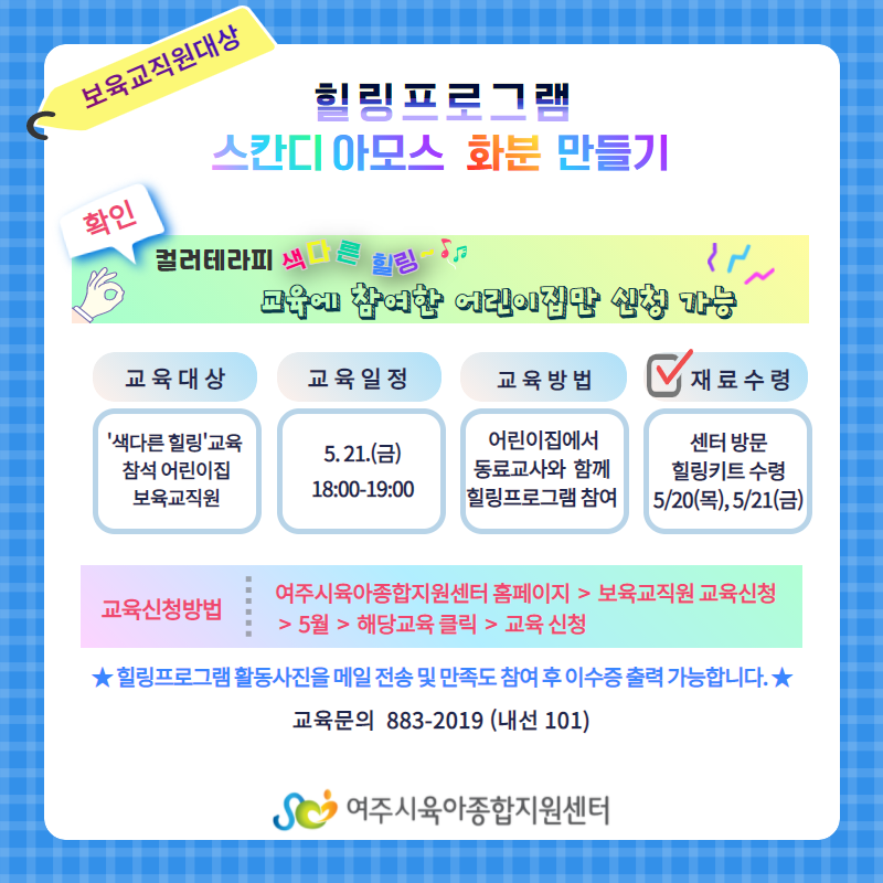 | ±âŸ»çÇ× | [º¸À°±³Á÷¿ø Èú¸µ±³À°1]Ä÷¯ Å×¶óÇÇ - »ö´Ù¸¥ Èú¸µ ±³À°À» ½ÅûÇϰí À̼ö ÇÑ ¾î¸°ÀÌÁý º¸À°±³Á÷¿ø¸¸ ½Åû°¡´ÉÇÕ´Ï´Ù. | ||
