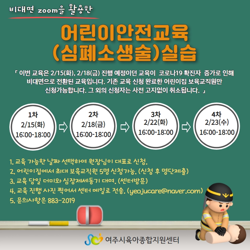 | ±âŸ»çÇ× | ¡Ú¡ÚÀÌ ±³À°Àº ´ë¸é±³À°À¸·Î ÁøÇà ¿¹Á¤ÀÌ´ø ±³À°ÀÌ Äڷγª19 È®ÁøÀÚ Áõ°¡·Î ÀÎÇØ ºñ´ë¸éÀ¸·Î ÀüȯµÈ ±³À°ÀÔ´Ï´Ù. ±âÁ¸ ±³À° ½Åû ¿Ï·áÇÑ ¾î¸°ÀÌÁý º¸À°±³Á÷¿ø¸¸ ½Åû °¡´ÉÇÕ´Ï´Ù. ±× ¿ÜÀÇ ½ÅûÀÚ´Â »çÀü °íÁö ¾øÀÌ Ãë¼ÒµË´Ï´Ù.¡Ú¡Ú 1. ¿øÀå´ÔÀÌ ¾î¸°ÀÌÁý ´ëÇ¥·Î ½ÅûÇÏ°í ½ÅûÀÚ ¸í´Ü ¼¾ÅÍ ¸ÞÀÏ·Î Á¦Ãâ. (ÃÖ´ë 5¸í±îÁö ½Åû ) 2. ±³À°´çÀÏ ´õ¹Ì¿Í ½ÉÀåÁ¦¼¼µ¿±â ¼¾ÅÍ ¹æ¹®ÇÏ¿© ´ë¿©. (¹Ý³³Àº ´ÙÀ½ ±³À°À» À§ÇØ ´ÙÀ½³¯ ¿ÀÀü±îÁö ¹Ý³³ÇØÁÖ¼¼¿ä.) 3. ±³À° ÁøÇà½Ã »çÁø(3~4Àå) Âï¾î ¼¾ÅÍ ¸ÞÀÏ·Î Àü¼Û. 4. ±³À° Âü¿©´Â ¿µ.À¯¾Æµé°ú ºÐ¸®µÈ °ø°£¿¡¼ ÁøÇà ÇÒ ¼ö ÀÖµµ·Ï Çϰí Áö¼ÓÀûÀ¸·Î ȸ鿡 º¸¿©ÁöÁö ¾ÊÀ» °æ¿ì À̼öÁõ ¹ß±ÞÀÌ ºÒ°¡ÇÒ ¼ö ÀÖÀ½. ¡Ø ¿©ÁÖ½ÃÀ°¾ÆÁ¾ÇÕÁö¿ø¼¾ÅÍ ¸ÞÀÏ yeojucare.naver.com |