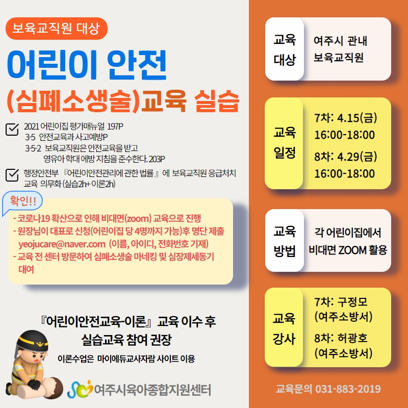 | ±âŸ»çÇ× | 1. ¿øÀå´ÔÀÌ ¾î¸°ÀÌÁý ´ëÇ¥·Î ½ÅûÇÏ°í ½ÅûÀÚ ¸í´Ü ¼¾ÅÍ ¸ÞÀÏ·Î Á¦Ãâ. (ÃÖ´ë 4¸í±îÁö ½Åû, À̸§, ¾ÆÀ̵ð, ÀüȹøÈ£ ±âÀç ) 2. ±³À°´çÀÏ ½ÉÆó¼Ò»ý¼ú ¸¶³×Å· ¹× ½ÉÀåÁ¦¼¼µ¿±â ¼¾ÅÍ ¹æ¹®ÇÏ¿© ´ë¿©. 3. ±³À° ÁøÇà½Ã »çÁø(3~4Àå) Âï¾î ¼¾ÅÍ ¸ÞÀÏ·Î Àü¼Û. 4. ±³À° Âü¿©´Â ¿µ.À¯¾Æµé°ú ºÐ¸®µÈ °ø°£¿¡¼ ÁøÇà ÇÒ ¼ö ÀÖµµ·Ï Çϰí Áö¼ÓÀûÀ¸·Î ȸ鿡 º¸¿©ÁöÁö ¾ÊÀ» °æ¿ì À̼öÁõ ¹ß±ÞÀÌ ºÒ°¡ÇÒ ¼ö ÀÖÀ½. ¡Ø ¿©ÁÖ½ÃÀ°¾ÆÁ¾ÇÕÁö¿ø¼¾ÅÍ ¸ÞÀÏ yeojucare.naver.com |