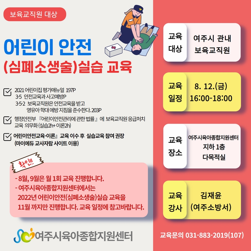 | ±âŸ»çÇ× | *¾î¸°À̾ÈÀü(½ÉÆó¼Ò»ý¼ú)½Ç½À ±³À°Àº 11¿ù±îÁö¸¸ ÁøÇàÇÕ´Ï´Ù. ±³À°ÀÏÁ¤ Âü°í ¹Ù¶ø´Ï´Ù. *±³À°½Åû ÈÄ Ãë¼Ò °¡´ÉÀÏ ÀÌÈÄ Ãë¼Ò ¹× ±³À° ´çÀÏ ¹ÌÂü¼® ½Ã <¿©ÁÖ½ÃÀ°¾ÆÁ¾ÇÕÁö¿ø¼¾ÅÍ>¿¡¼ ÁøÇàÇÏ´Â 2022³â ¾î¸°À̾ÈÀü(½ÉÆó¼Ò»ý¼ú)½Ç½À±³À°¿¡ Âü¿© ÇÒ ¼ö ¾ø½À´Ï´Ù. *¼¾ÅÍ ÁÖÂ÷ÀåÀÌ ¸Å¿ì Çù¼ÒÇÕ´Ï´Ù. ÁÖÂ÷·Î ÀÎÇØ ´ÊÁö ¾Êµµ·Ï ¼µÑ·¯ÁÖ¼¼¿ä. (±³À°½ÃÀÛ 10ºÐ ÈÄ ±³À°½Ç ÃâÀÔÀÌ Á¦ÇÑµÇ¸ç ±³À° ¹Ì¼ö·á󸮵˴ϴÙ.) |