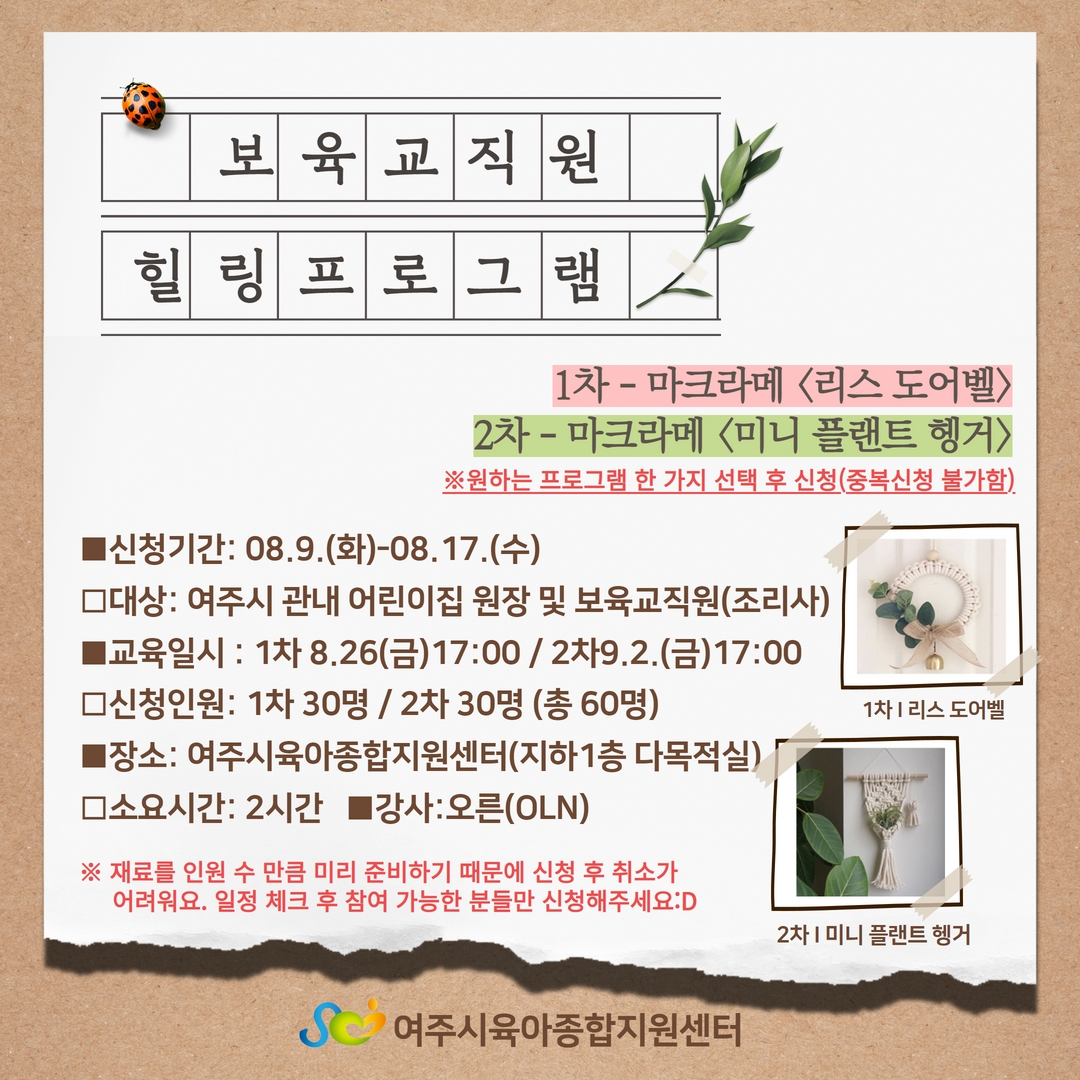 | ±âŸ»çÇ× | ¡Û 1Â÷ 8/26(±Ý), 2Â÷ 9/2(±Ý) Èú¸µÇÁ·Î±×·¥ Áß ÇÑ °¡Áö¸¸ ¼±ÅÃÇÏ¿© ½Åû °¡´É(µÎ °¡Áö ½Åû ºÒ°¡ ÇÔ) ¡Û Èú¸µÇÁ·Î±×·¥ ½Åû ÈÄ ºÒÂü½Ã ÃßÈÄ ¼¾ÅÍ¿¡¼ ÁøÇàµÇ´Â ¸ðµç Èú¸µÇÁ·Î±×·¥ ½Åû Á¦ÇÑ µÊ. ¡Û Ãʺ¸ÀÚµµ Âü¿©°¡´ÉÇÏ¸ç ¼Ò¿ä½Ã°£ 2½Ã°£(°³ÀÎÂ÷ ÀÖÀ½) |