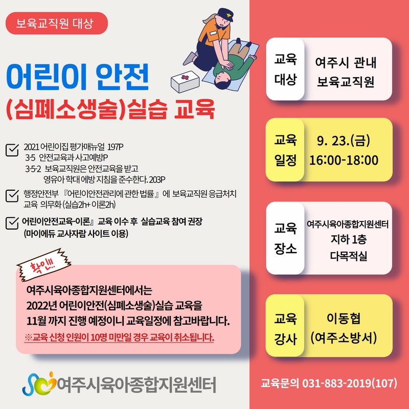 | ±âŸ»çÇ× | *¾î¸°À̾ÈÀü(½ÉÆó¼Ò»ý¼ú)½Ç½À ±³À°Àº 11¿ù±îÁö¸¸ ÁøÇàÇÕ´Ï´Ù. ±³À°ÀÏÁ¤ Âü°íÇØÁÖ¼¼¿ä. *±³À° ½ÅûÀοøÀÌ 10¸í ¹Ì¸¸ÀÏ °æ¿ì ±³À°ÀÌ Ãë¼ÒµË´Ï´Ù. ¾çÇØ¹Ù¶ø´Ï´Ù. *±³À°½Åû ÈÄ Ãë¼Ò °¡´ÉÀÏ ÀÌÈÄ Ãë¼Ò ¹× ±³À° ´çÀÏ ¹ÌÂü¼® ½Ã <¿©ÁÖ½ÃÀ°¾ÆÁ¾ÇÕÁö¿ø¼¾ÅÍ>¿¡¼ ÁøÇàÇÏ´Â 2022³â ¾î¸°À̾ÈÀü(½ÉÆó¼Ò»ý¼ú)½Ç½À±³À°¿¡ Âü¿© ÇÒ ¼ö ¾ø½À´Ï´Ù. *¼¾ÅÍ ÁÖÂ÷ÀåÀÌ ¸Å¿ì Çù¼ÒÇÕ´Ï´Ù. ÁÖÂ÷·Î ÀÎÇØ ´ÊÁö ¾Êµµ·Ï ¼µÑ·¯ÁÖ¼¼¿ä. (±³À°½ÃÀÛ 10ºÐ ÈÄ ±³À°½Ç ÃâÀÔÀÌ Á¦ÇÑµÇ¸ç ±³À° ¹Ì¼ö·á󸮵˴ϴÙ.) |