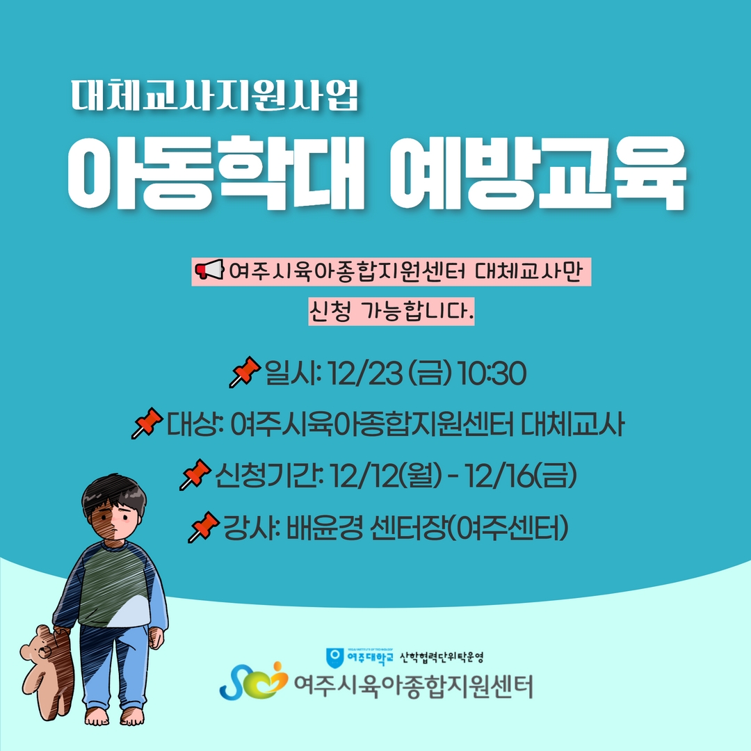 | ±âŸ»çÇ× | ¡Ø¿©ÁÖ½ÃÀ°¾ÆÁ¾ÇÕÁö¿ø¼¾ÅÍ ´ëü±³»ç ´ë»ó ±³À°À¸·Î ´ëü±³»ç¸¸ ½Åû °¡´ÉÇÕ´Ï´Ù. | ||