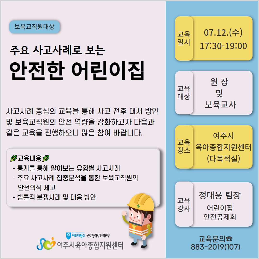 | °»ç | Á¤´ë¿ë ÆÀÀå(¾î¸°ÀÌÁý¾ÈÀü°øÁ¦È¸) | Àå¼Ò | ¿©ÁÖ½ÃÀ°¾ÆÁ¾ÇÕÁö¿ø¼¾ÅÍ ÁöÇÏ1Ãþ ´Ù¸ñÀû½Ç |