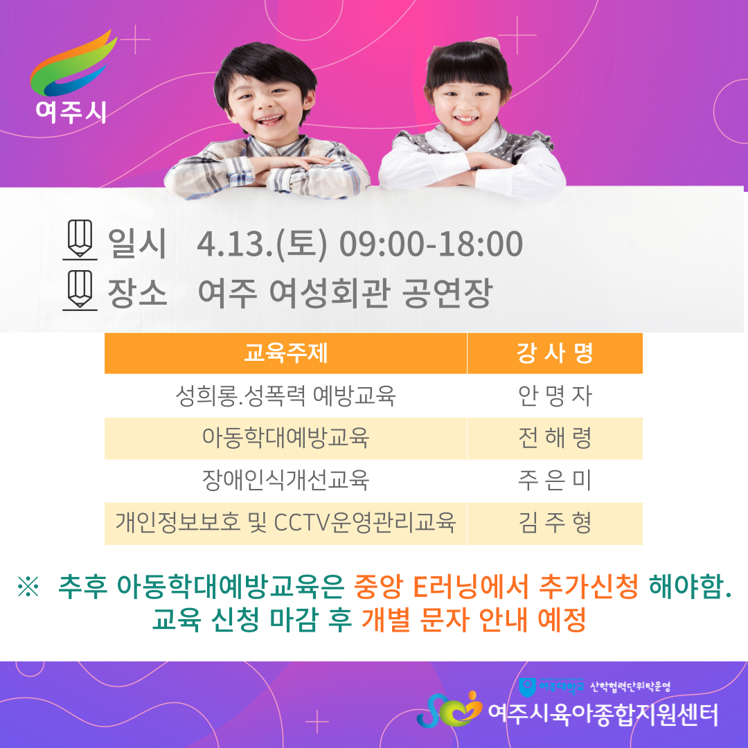 | ±âŸ»çÇ× | ¡Ú ´ë¸é±³À°ÀÔ´Ï´Ù. 09:00 - 18:00 ¡Ú¡Ú ÇʼöÀǹ«±³À°À¸·Î Ãâ°á üũ 3ȸ ÁøÇà ¿¹Á¤ÀÔ´Ï´Ù. ¡Ú¡Ú¡Ú ÃßÈÄ ¾Æµ¿Çд뿹¹æ±³À°Àº Áß¾Ó ÀÌ·¯´×¿¡¼ Ãß°¡ ½ÅÃ»ÇØ¾ßÇÕ´Ï´Ù. ±³À° ½Åû ¸¶°¨ ÈÄ °³º° ¹®ÀÚ ¾È³» ¿¹Á¤ÀÔ´Ï´Ù. |
