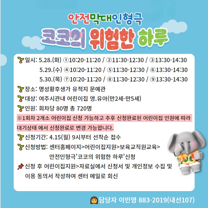 | ±âŸ»çÇ× | ¡á 9ȸÂ÷·Î ÁøÇàµÇ´Â °ø¿¬ÀÔ´Ï´Ù. ³¯Â¥¿Í ½Ã°£À» Á¤È®È÷ È®ÀÎÇÏ¿© ½Åû¹Ù¶ø´Ï´Ù. ¡á ½Åû¿Ï·á ÈÄ ¾î¸°ÀÌÁý ½Åû Àοø¿¡ µû¶ó ÀϺΠ¶Ç´Â Àü¿ø °ø¿¬ ½Ã°£ ¹× ³¯Â¥°¡ ÇùÀÇ ÈÄ º¯°æµÉ ¼ö ÀÖ½À´Ï´Ù. ¡á ´ë±â½Åû ¾î¸°ÀÌÁýÀº ½Åû¿Ï·á µÈ ¾î¸°ÀÌÁýÀÇ Àοø¿¡ µû¶ó ¼øÂ÷ÀûÀ¸·Î ½Åû¿Ï·á·Î º¯°æÇØ µå¸± ¼ö ÀÖ½À´Ï´Ù. |
