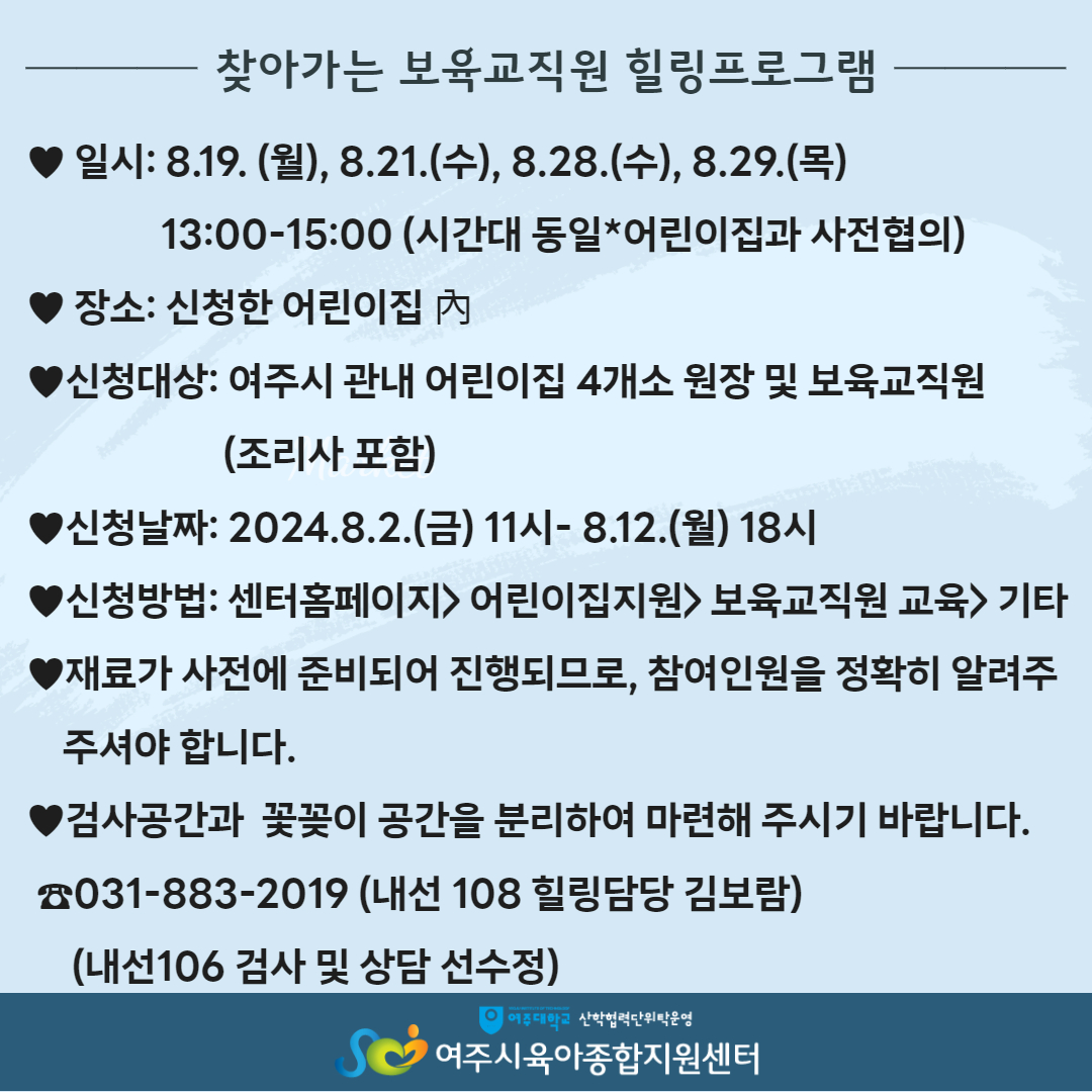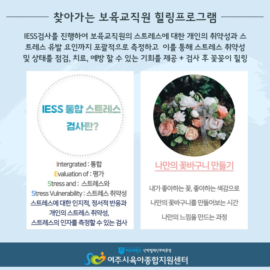 | ±âŸ»çÇ× | IESS ÅëÇÕ½ºÆ®·¹½º °Ë»ç¸¦ ÅëÇÏ¿©, º¸À°±³»çÀÇ ½ºÆ®·¹½º¸¦ Á¡°ËÇÏ°í »ó´ãÀ» ÅëÇÏ¿© Ä¡·á, ¿¹¹æÀ» ÇϰíÀÚ ÇÕ´Ï´Ù. ¶ÇÇÑ, »ó´ã ÈÄ¿¡´Â ²É²ÈÀ̸¦ Çϸç Èú¸µÀÇ ½Ã°£À» °®´Â ÇÁ·Î±×·¥ÀÔ´Ï´Ù., - ½Ã°£À» Á¶À²ÇÏ¿© ½ÅûÇÑ ¾î¸°ÀÌÁý¿¡ ¹æ¹®ÇÕ´Ï´Ù. - »ó´ãÇÒ °ø°£°ú ²É²ÈÀÌ ÇÒ °ø°£ÀÌ ÇÊ¿ä ÇÕ´Ï´Ù. |