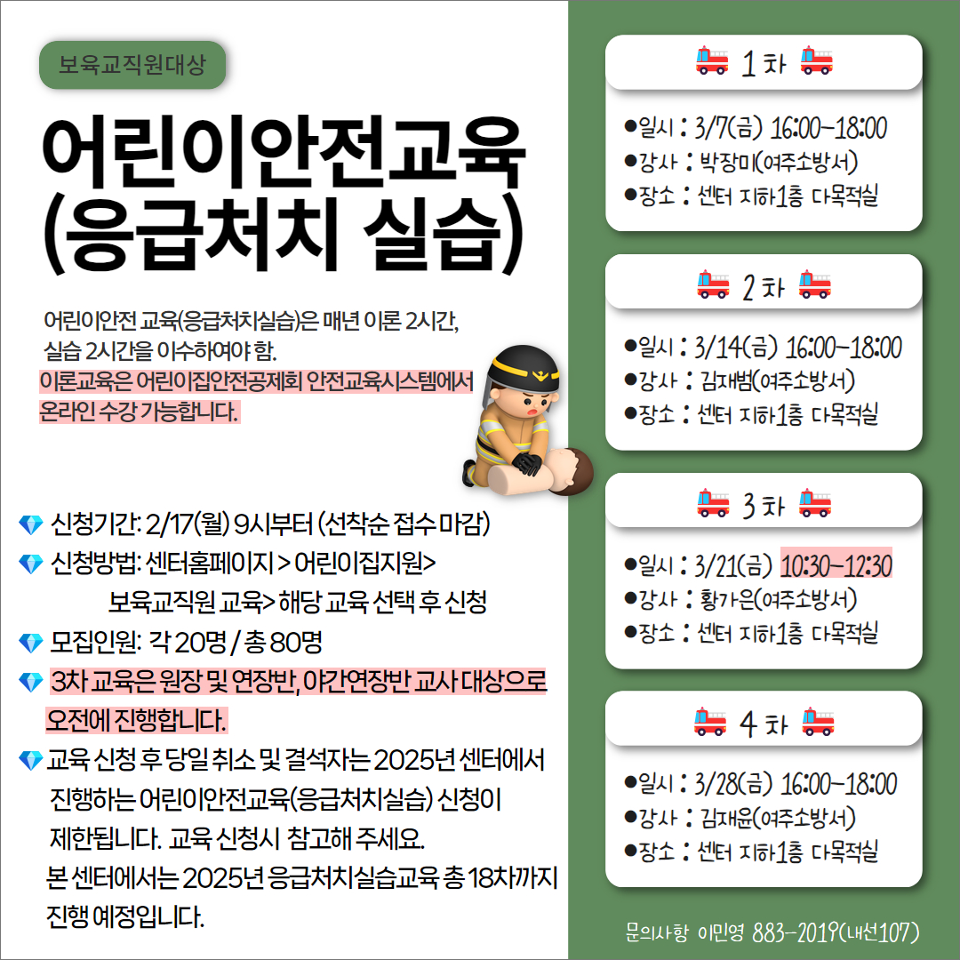 | ±âŸ»çÇ× | *±³À° ½ÃÀÛ 5ºÐ Àü±îÁö ÀÔ½Ç ¿Ï·áÇØ ÁÖ½Ã°í ±³À° ½ÃÀÛ 10ºÐ ÈÄ ÀÔÀå ºÒ°¡ÇÕ´Ï´Ù. *±³À° ´çÀÏ Ãë¼Ò ¹× °á¼®Àº 2025³â ¼¾ÅÍ ÁøÇà ¾î¸°ÀÌ ¾ÈÀü±³À°(ÀÀ±Þóġ ½Ç½À) ½Åû ºÒ°¡ÇÕ´Ï´Ù. *¼¾ÅÍ ÁÖÂ÷ÀåÀÌ ¸Å¿ì Çù¼ÒÇÕ´Ï´Ù. ÁÖÂ÷·Î ÀÎÇØ ´ÊÁö ¾Êµµ·Ï ¼µÑ·¯ ÁÖ¼¼¿ä. |