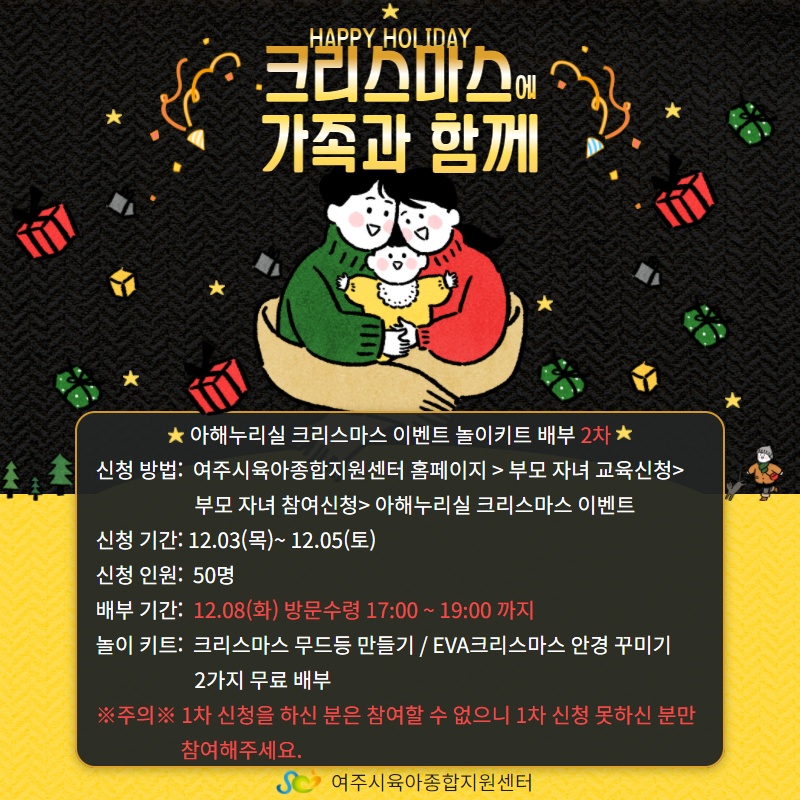º» Å©¸®½º¸¶½º À̺¥Æ® ³îÀÌŰƮ´Â 12¿ù 08ÀÏ 17½ÃºÎÅÍ 19½Ã±îÁö ¿©ÁÖ½ÃÀ°¾ÆÁ¾ÇÕÁö¿ø¼¾ÅÍ 2Ãþ ¾ÆÇØ´©¸®½Ç ¾Õ¿¡¼­ ¹èºÎÇØ µå¸³´Ï´Ù.