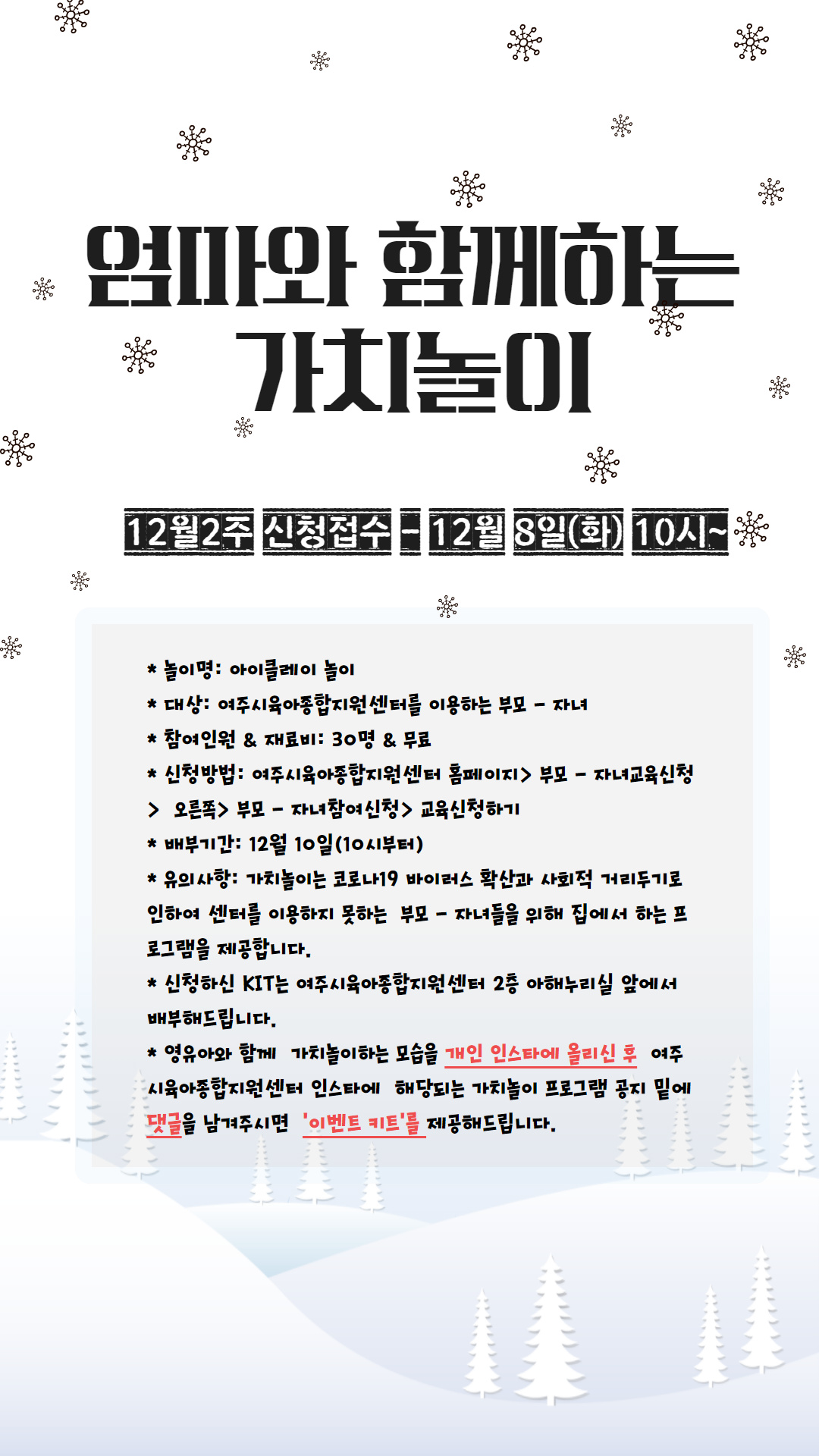½Å û : ¿©ÁÖ½ÃÀ°¾ÆÁ¾ÇÕÁö¿ø¼¾ÅÍ È¨ÆäÀÌÁö Á¢¼ö ½Åû±â°£ : 2020³â 12¿ù 8ÀÏ ¿ÀÀü 10:00 ~ ¼±Âø¼øÁ¢¼ö(30¸í)º» °¡Ä¡³îÀÌ ¹èºÎ´Â 12¿ù 10ÀÏ 10½Ã20ºÐ¿¡ ¿©ÁÖ½ÃÀ°¾ÆÁ¾ÇÕÁö¿ø¼¾ÅÍ 2Ãþ ¾ÆÇØ´©¸®½Ç¿¡¼ ¹èºÎÇØ µå¸³´Ï´Ù.