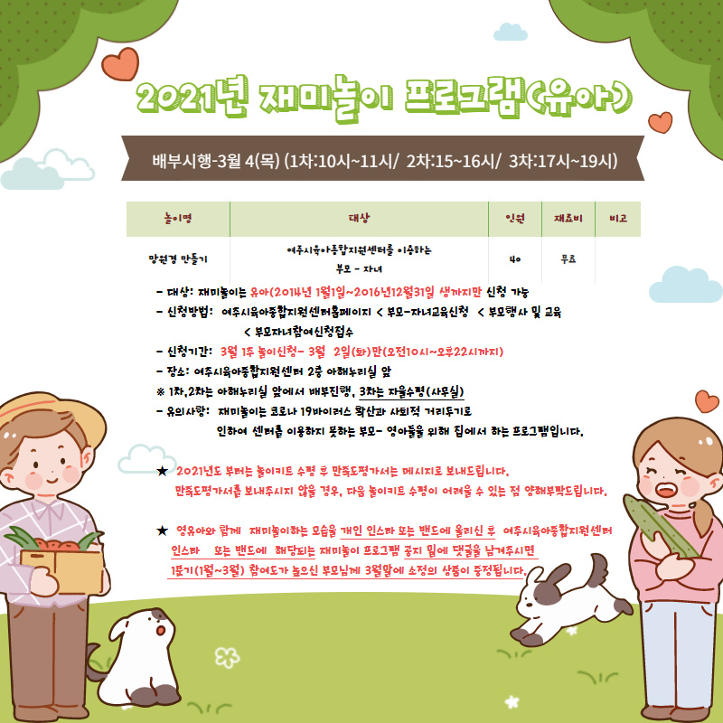 ½Å û : ¿©ÁÖ½ÃÀ°¾ÆÁ¾ÇÕÁö¿ø¼¾ÅÍ È¨ÆäÀÌÁö Á¢¼ö ½Åû±â°£ : 2020³â 3¿ù 2ÀÏ ¿ÀÀü 10:00 ~ ¼±Âø¼øÁ¢¼ö(30¸í)º» °¡Ä¡³îÀÌ ¹èºÎ´Â 3¿ù 4ÀÏ 15½Ã¿¡ ¿©ÁÖ½ÃÀ°¾ÆÁ¾ÇÕÁö¿ø¼¾ÅÍ 2Ãþ