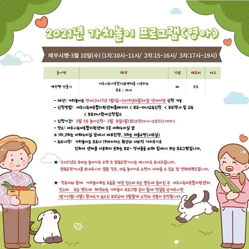 ½Å û : ¿©ÁÖ½ÃÀ°¾ÆÁ¾ÇÕÁö¿ø¼¾ÅÍ È¨ÆäÀÌÁö Á¢¼ö ½Åû±â°£ : 2020³â 3¿ù 8ÀÏ ¿ÀÀü 10:00 ~ ¼±Âø¼øÁ¢¼ö(20¸í)º» °¡Ä¡³îÀÌ ¹èºÎ´Â 3¿ù 10ÀÏ 10½Ã¿¡ ¿©ÁÖ½ÃÀ°¾ÆÁ¾ÇÕÁö¿ø¼¾ÅÍ 2Ãþ