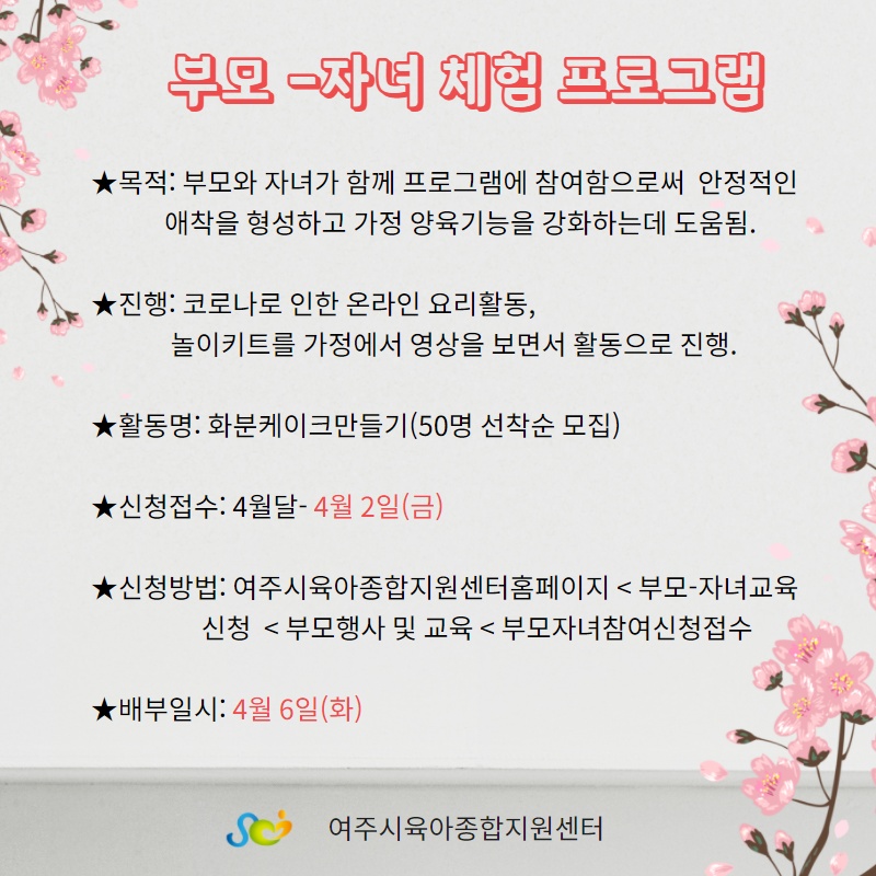 ½Å û : ¿©ÁÖ½ÃÀ°¾ÆÁ¾ÇÕÁö¿ø¼¾ÅÍ È¨ÆäÀÌÁö Á¢¼ö ½Åû±â°£ : 2020³â 4¿ù 2ÀÏ ¿ÀÀü 10:00 ~ ¼±Âø¼øÁ¢¼ö(50¸í)º» °¡Ä¡³îÀÌ ¹èºÎ´Â 4¿ù 6ÀÏ 10½Ã~18½Ã±îÁö ¿©ÁÖ½ÃÀ°¾ÆÁ¾ÇÕÁö¿ø¼¾ÅÍ 2Ãþ