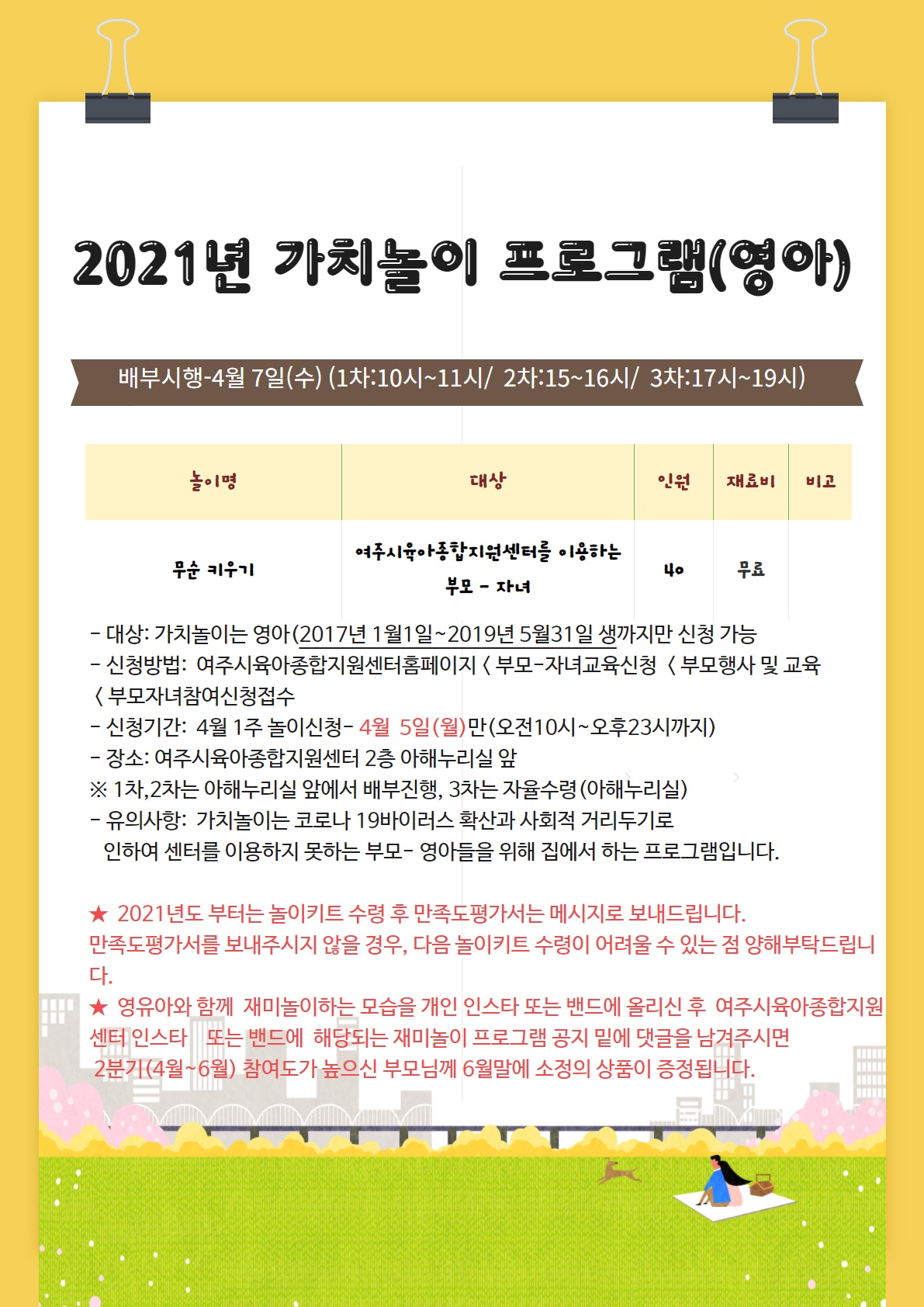 ±âŸ»çÇ× 4¿ù 7ÀÏ ¿©ÁÖÀ°¾ÆÁ¾ÇÕÁö¿ø¼¾ÅÍ 2Ãþ ¾ÆÇØ´©¸®½Ç ¾Õ¿¡¼­ 10½ÃºÎÅÍ 11½Ã±îÁö ¹èºÎÇØµå¸³´Ï´Ù.