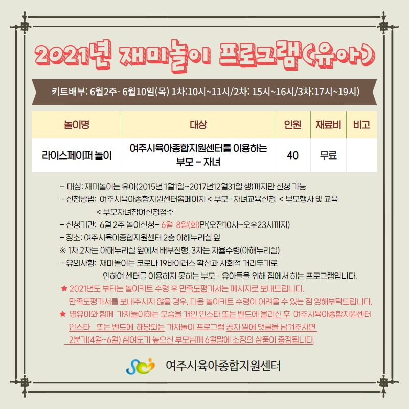 ½Å û : ¿©ÁÖ½ÃÀ°¾ÆÁ¾ÇÕÁö¿ø¼¾ÅÍ È¨ÆäÀÌÁö Á¢¼ö ½Åû±â°£ : 2020³â 6¿ù 8ÀÏ ¿ÀÀü 10:00 ~ ¼±Âø¼øÁ¢¼ö(20¸í) ´ë »ó : 2015³â 1¿ù1ÀÏ ~ 2017³â 12¿ù 31ÀÏ»ý±îÁö ½ÅûÁ¢¼ö °¡´ÉÇÕ´Ï´Ù.º» Àç¹Ì³îÀÌ ¹èºÎ´Â 6¿ù 10ÀÏ¿¡ ¿©ÁÖ½ÃÀ°¾ÆÁ¾ÇÕÁö¿ø¼¾ÅÍ 2Ãþ