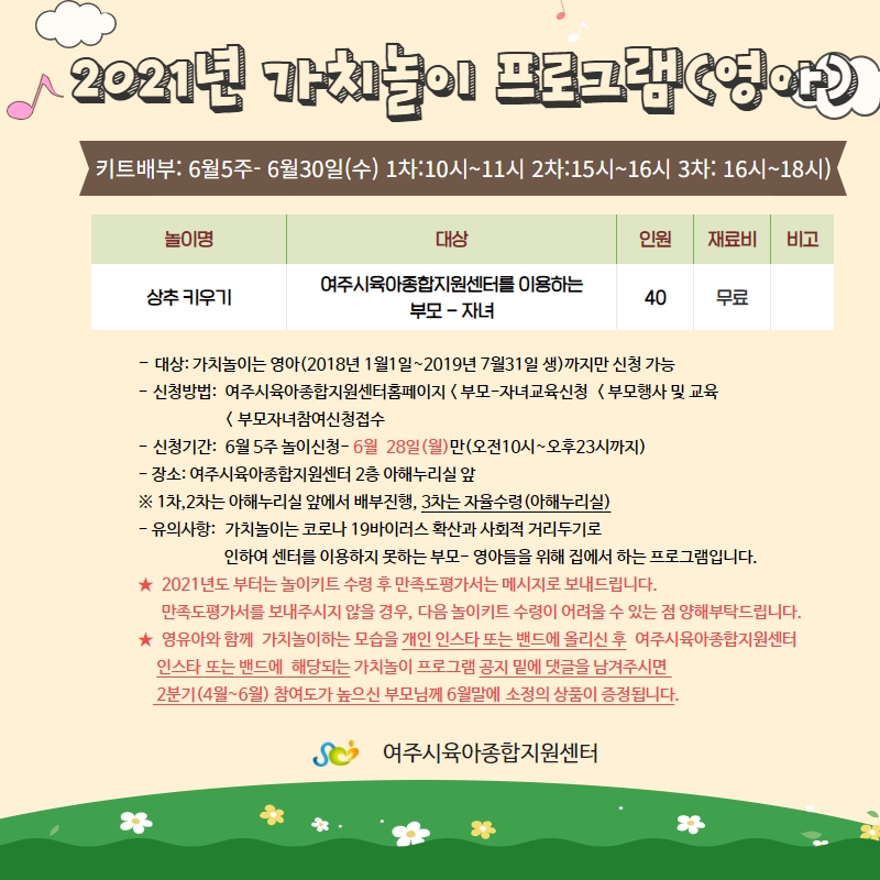 ½Å û : ¿©ÁÖ½ÃÀ°¾ÆÁ¾ÇÕÁö¿ø¼¾ÅÍ È¨ÆäÀÌÁö Á¢¼ö ½Åû±â°£ : 2020³â 6¿ù 28ÀÏ ¿ÀÀü 10:00 ~ ¼±Âø¼øÁ¢¼ö(20¸í)¡Ø ½Åû°¡´ÉÇÑ »ý³â¿ùÀÏÀº: 2018³â 1¿ù1ÀÏ~ 2019³â 12¿ù31ÀÏ