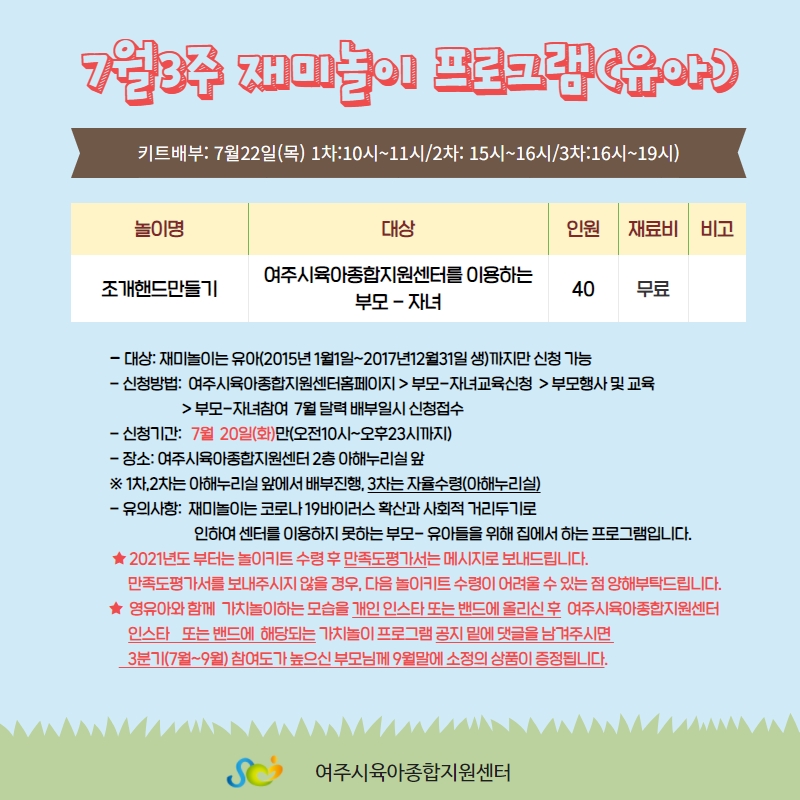 ½Å û : ¿©ÁÖ½ÃÀ°¾ÆÁ¾ÇÕÁö¿ø¼¾ÅÍ È¨ÆäÀÌÁö Á¢¼ö ½Åû±â°£ : 2020³â 7¿ù 22ÀÏ ¿ÀÀü 10:00 ~ ¼±Âø¼øÁ¢¼ö(20¸í) ´ë »ó : 2015³â 1¿ù1ÀÏ ~ 2017³â 12¿ù 31ÀÏ»ý±îÁö ½ÅûÁ¢¼ö °¡´ÉÇÕ´Ï´Ù.º» Àç¹Ì³îÀÌ ¹èºÎ´Â 7¿ù 20ÀÏ¿¡ ¿©ÁÖ½ÃÀ°¾ÆÁ¾ÇÕÁö¿ø¼¾ÅÍ 2Ãþ