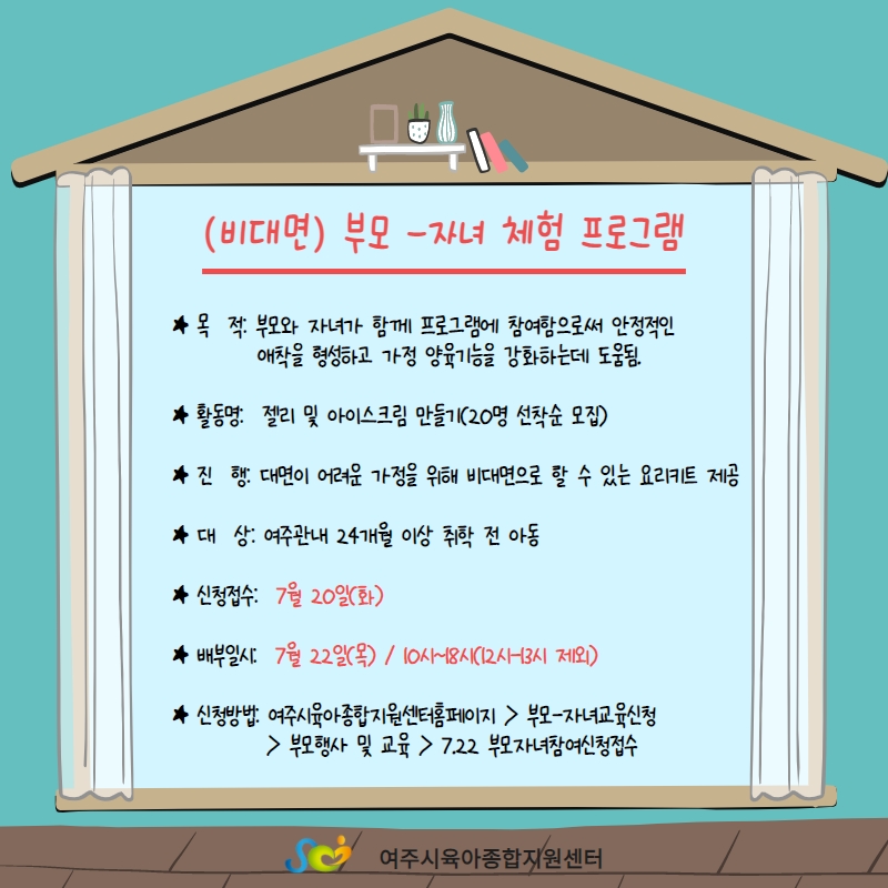 ½Å û : ¿©ÁÖ½ÃÀ°¾ÆÁ¾ÇÕÁö¿ø¼¾ÅÍ È¨ÆäÀÌÁö Á¢¼ö ½Åû±â°£ : 2020³â 7¿ù 20ÀÏ ¿ÀÀü 10:00 ~ ¼±Âø¼øÁ¢¼ö(20¸í)º» ³îÀÌŰƮ ¹èºÎ´Â 7¿ù 22ÀÏ ¿©ÁÖ½ÃÀ°¾ÆÁ¾ÇÕÁö¿ø¼¾ÅÍ 2Ãþ