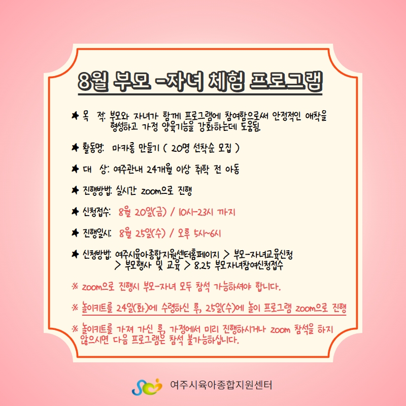 | ±âŸ»çÇ× | ¡Ú 24ÀÏ(È)¿¡ ŰƮ ¼ö·É ÈÄ, 25ÀÏ(¼ö) ºÎ¸ð¿ÍÀڳడ ÇÔ²² ½Ç½Ã°£ zoomÀ¸·Î ³îÀÌ ÇÁ·Î±×·¥ ÁøÇà ¡Ø Å°Æ® ¼ö·É¸¸ ÇϽðí, zoomÀ» Âü¼®ÇÏÁö ¾ÊÀ¸½Ã°Å³ª, ¹Ì¸® ÇÏ½Ã°Ô µÇ¸é ´ÙÀ½ ÇÁ·Î±×·¥ Âü¿©°¡ ºÒ°¡´ÉÇÕ´Ï´Ù. |