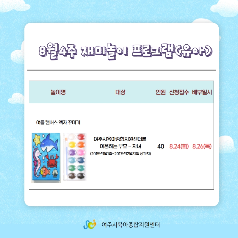 ½Åû±â°£ : 2020³â 8¿ù 24ÀÏ ¿ÀÀü 10:00 ~ ¼±Âø¼øÁ¢¼ö(20¸í) ´ë »ó : 2015³â 1¿ù1ÀÏ ~ 2017³â 12¿ù 31ÀÏ»ý±îÁö ½ÅûÁ¢¼ö °¡´ÉÇÕ´Ï´Ù.º» Àç¹Ì³îÀÌ ¹èºÎ´Â 8¿ù 26ÀÏ¿¡ ¿©ÁÖ½ÃÀ°¾ÆÁ¾ÇÕÁö¿ø¼¾ÅÍ 2Ãþ ¾ÆÇØ´©¸®½Ç ¾Õ¿¡¼ ¹èºÎÇØ µå¸³´Ï´Ù.