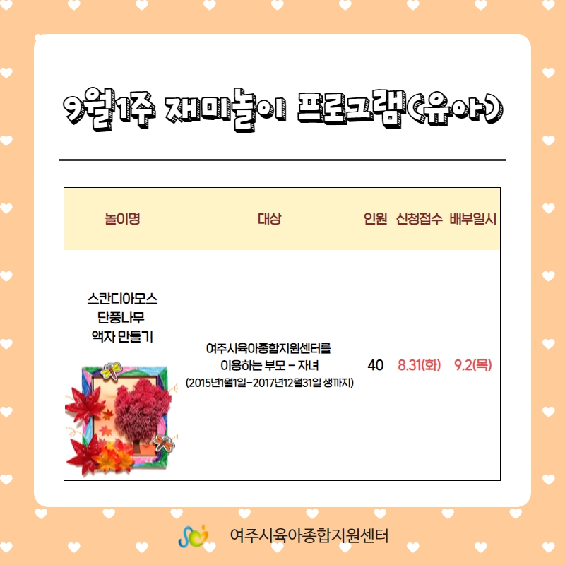 º» Àç¹Ì³îÀÌ ¹èºÎ´Â 9¿ù 2ÀÏ¿¡ ¿©ÁÖ½ÃÀ°¾ÆÁ¾ÇÕÁö¿ø¼¾ÅÍ 2Ãþ ¾ÆÇØ´©¸®½Ç ¾Õ¿¡¼­ ¹èºÎÇØ µå¸³´Ï´Ù.
